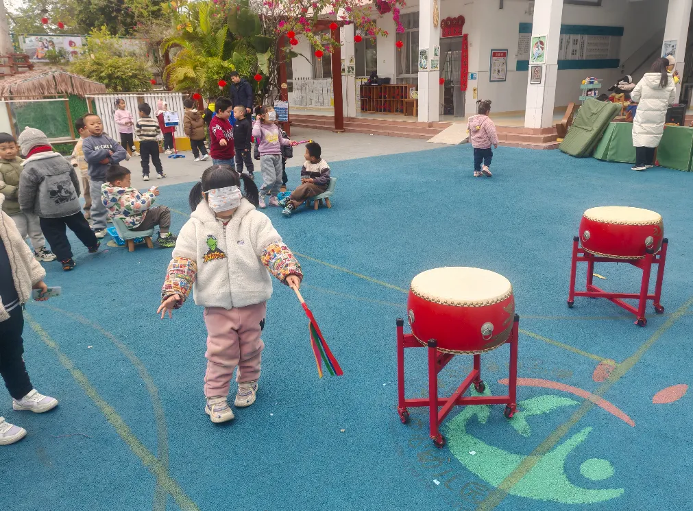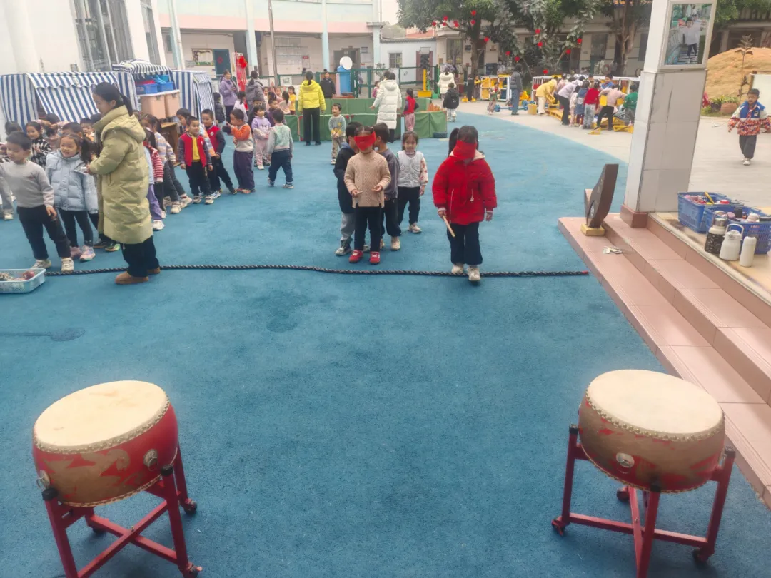 蒙面击鼓,敲中一次鼓就得一块钱。幼儿需要用红领巾把眼睛蒙住,然后开始转圈再过去敲鼓,一个幼儿耗费的时间比较长,老师又要当老板,又要给幼儿绑红领巾,实在是忙的不可开交。由于需要转圈才能过去敲鼓,游戏难度提高,幼儿敲中的几率就变小了,而且排队的时间过久。