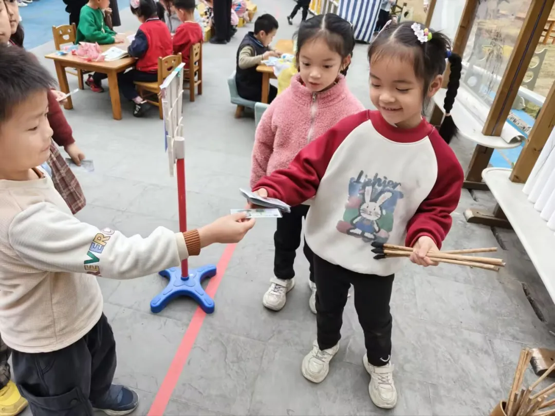 投壶这里也吸引了很多的幼儿,1块钱领5支剑,投中1个就得1块钱。她们仔细看着游戏规则,要花钱才能玩的游戏,幼儿很认真的进行投壶,并且有个幼儿还当起了老板。