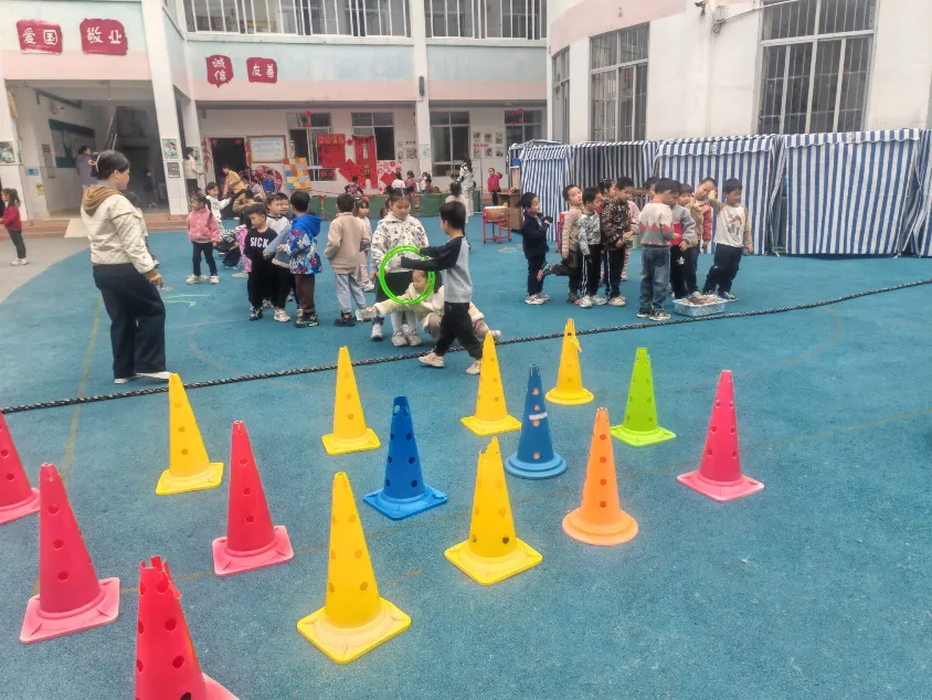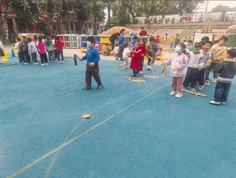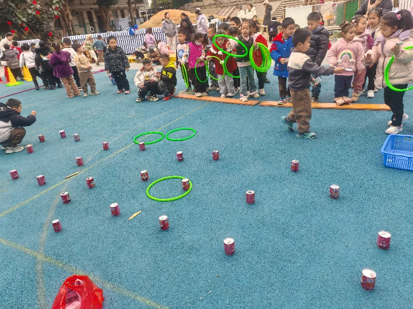 我们撤掉了蒙面击鼓,在这里进行了套圈游戏,在规定的线外面进行套圈,套中了就可以之间领礼品,没一会,套圈这里就聚集了一堆幼儿,他们花着赚到的钱进行着套圈游戏。
