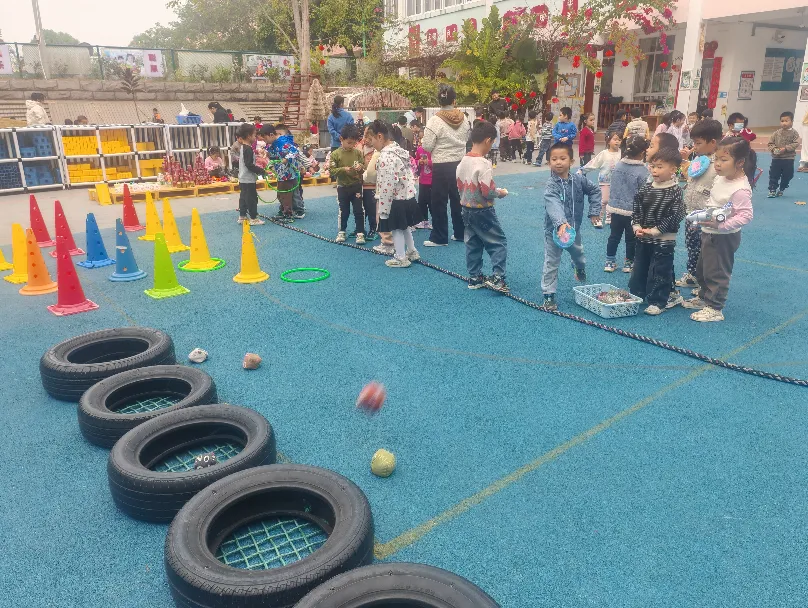 丢沙包和套圈的地方也增宽,幼儿开心的套圈和丢沙包进行赚钱,有的孩子还会和同伴分享“我投中了3个圈,得了3元!”