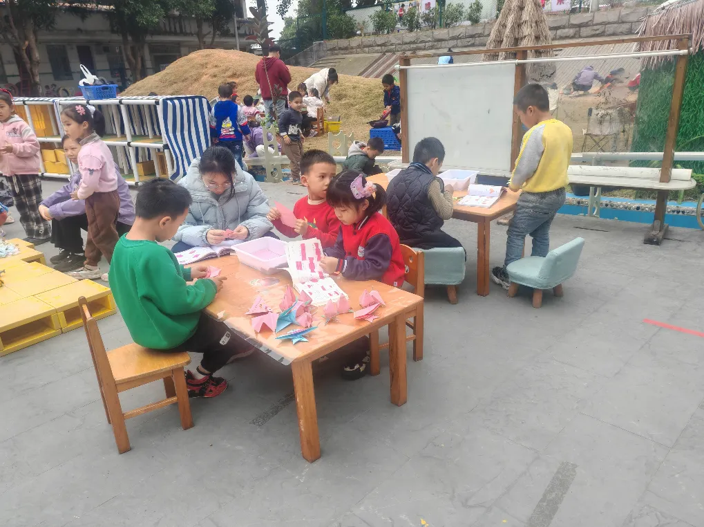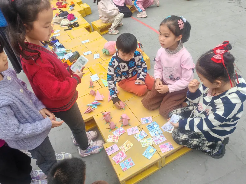 增加了折纸和剪纸区,幼儿可以在这里进行折纸和剪纸小游戏。价格海报清晰明了,幼儿尝试用“买一送一”吸引顾客。交易时,幼儿能正确找零,还会主动帮助能力弱的幼儿计算价格,比如“这个包包3元,你给我5元,我找你2元。”