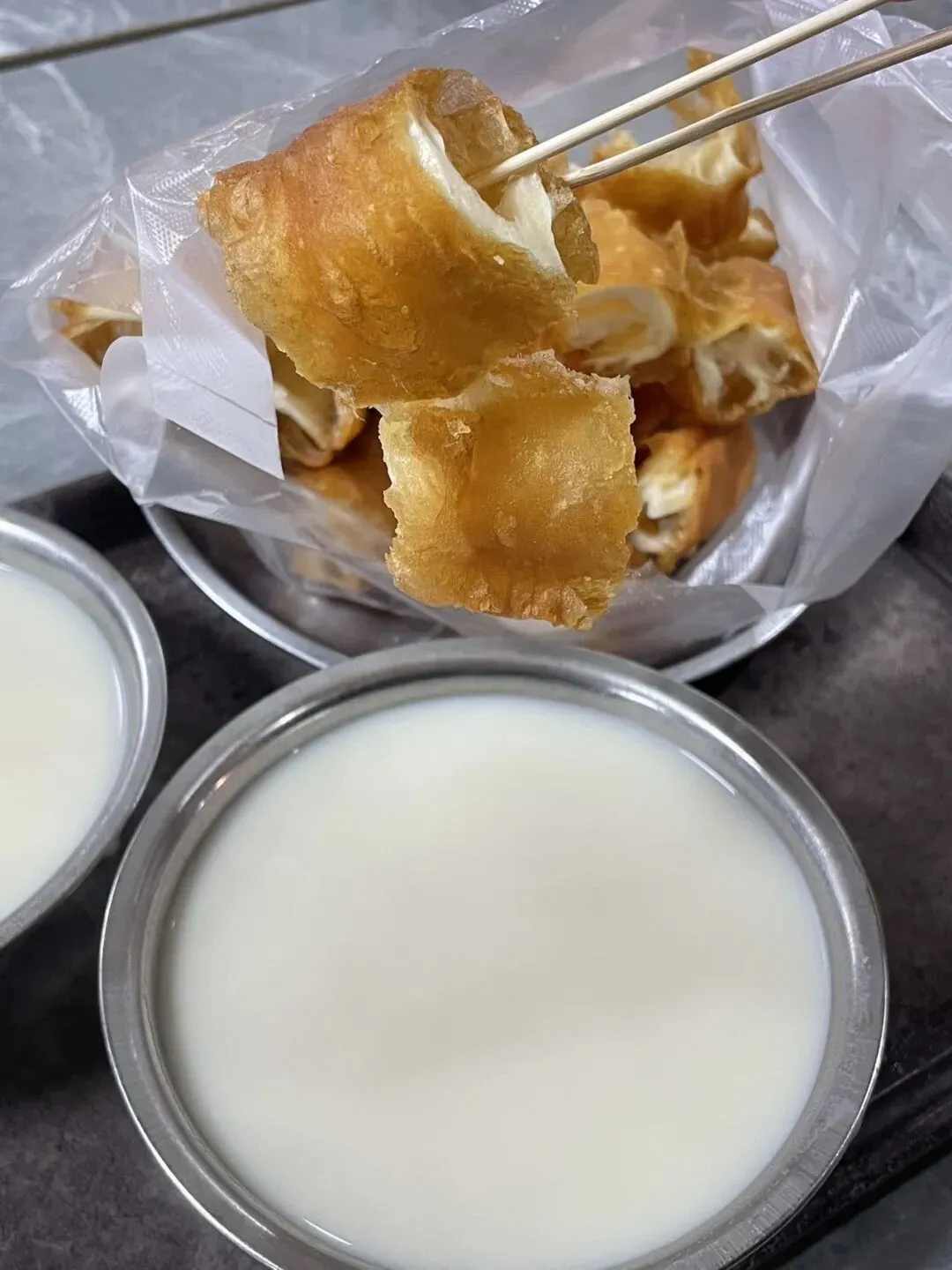 油条面衣薄薄的,酥脆得正合我意。在豆浆稍浸片刻即吸满汁水;豆浆一喝就知道是现磨的,喝一口胃马上暖暖的。