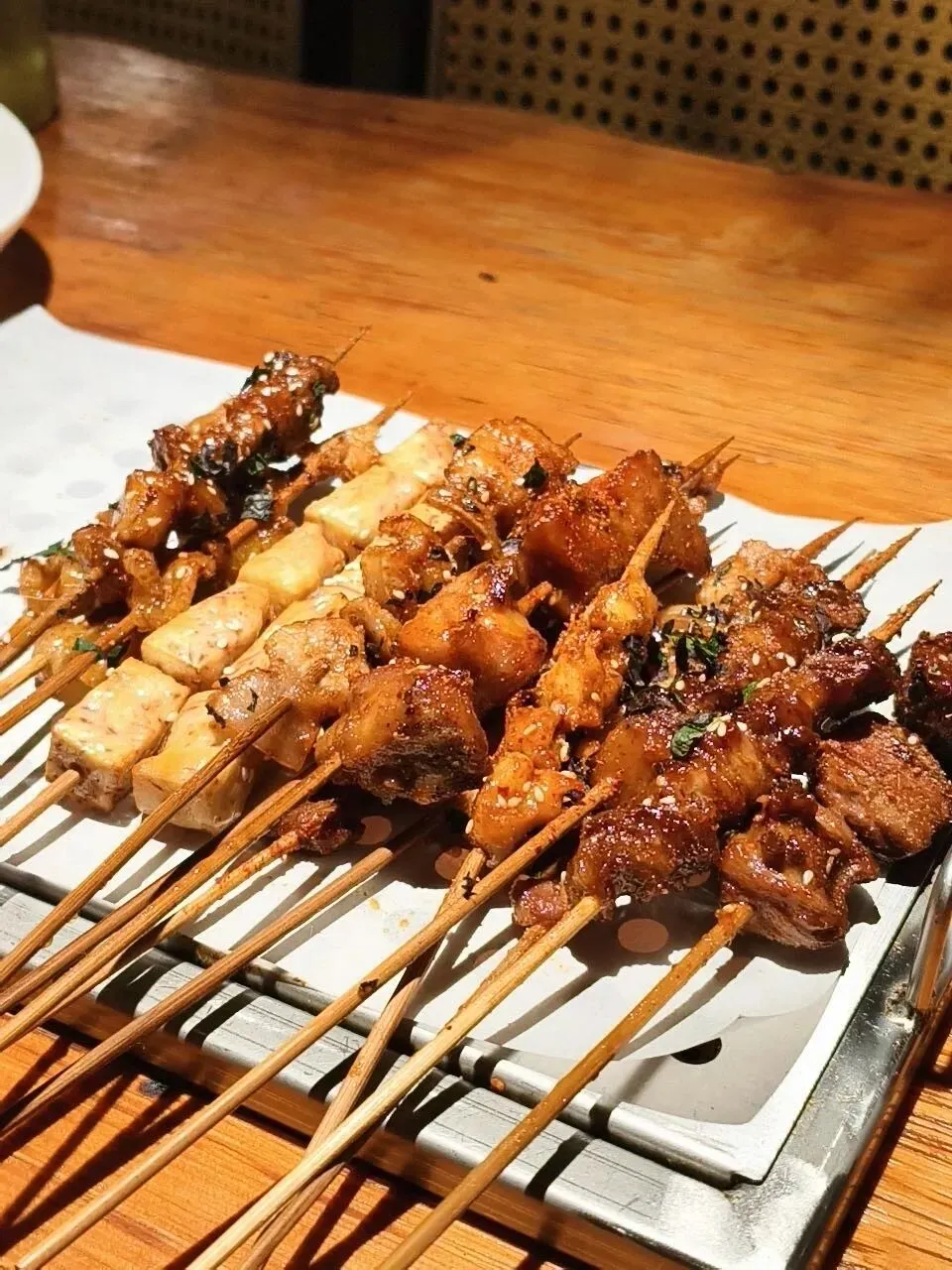 抹上青梅酱和加上紫苏的肉串简直太得我心了!肉在酸甜酱汁的加成下,香味变得更明显,香香嫩嫩的;牛油焦香焦香的,一口爆油。每一串都有自己的特色,香得我们以服务员上一串马上清一串,上一堆马上