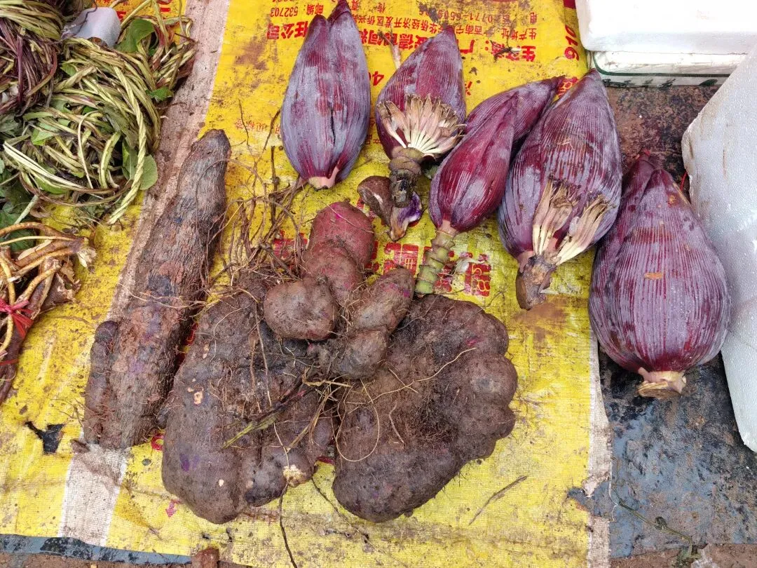 1)芭蕉花和参薯。芭蕉花的吃法可多了,比如云南的“红烧肉罐头煮芭蕉花”,有没有朋友推荐下你最爱的做法?参薯,在我家叫大薯。我家有种紫色的,拿来煮汤或者磨成泥去炸糍粑,咸口∽
