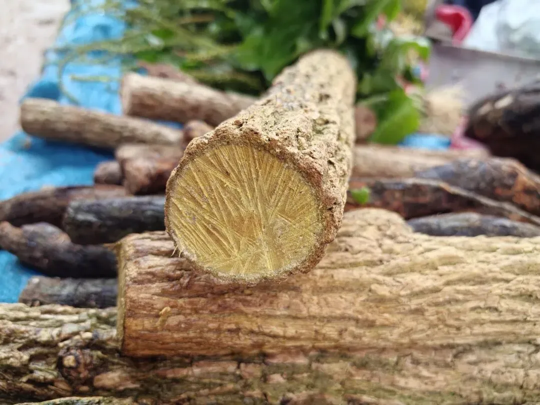 2)鸡血藤,这个是豆科的,具体哪个种不知道。茎刚切开的时候,会冒出红色汁液,起名的人觉得像鸡血,所以得名“鸡血藤”。《中国药典》里,鸡血藤的基原植物是密花豆(Spatholobus suberectus),但在民间的实际运用中,鸡血藤还包含了除密花豆以外的多种植物。