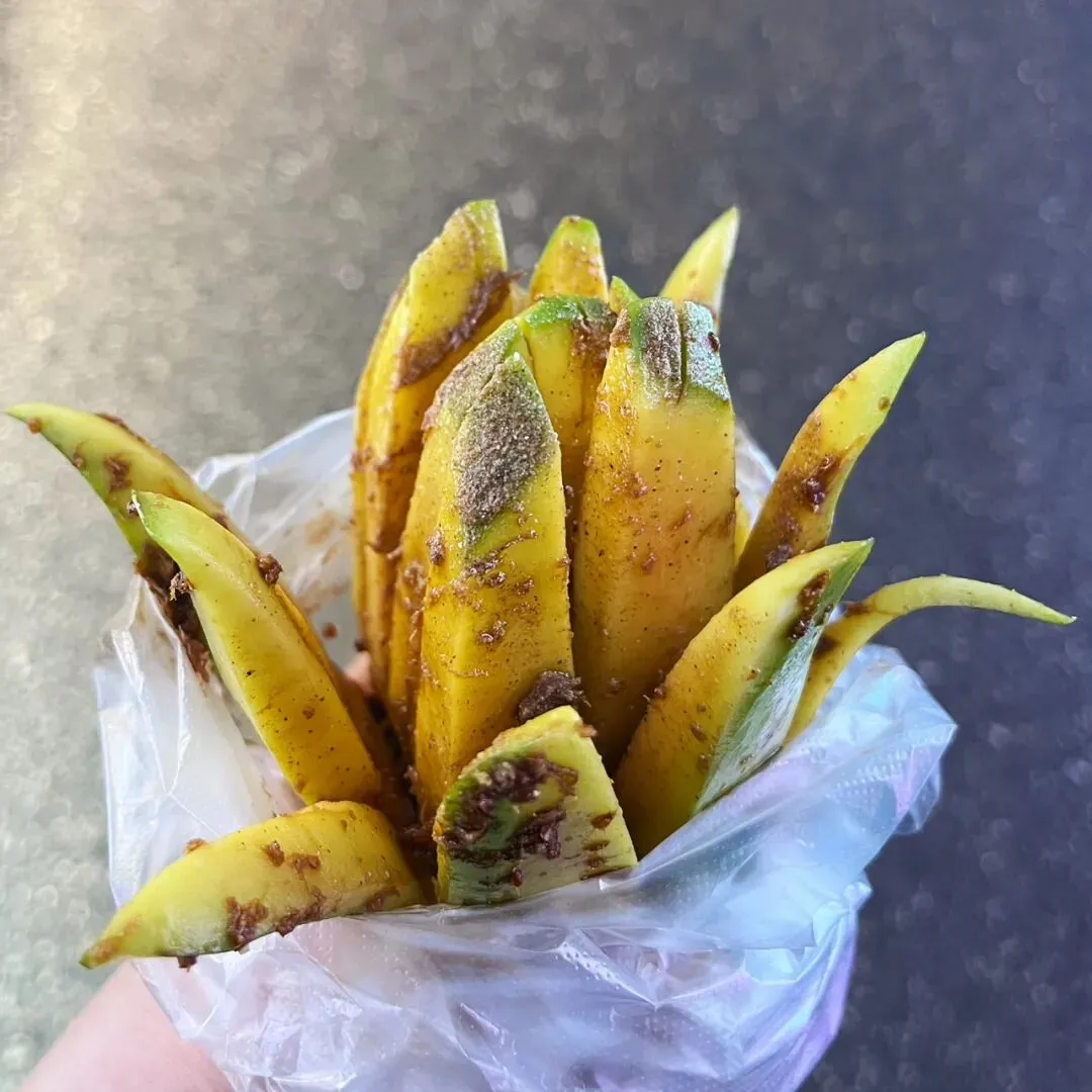 切开的青芒果,浸入酸梅汁里,再撒上椒盐,酸脆解腻,5块钱一个。