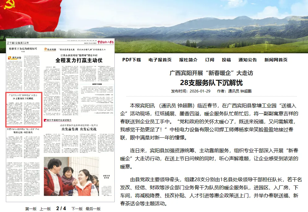 1月29日出版的《中国组织人事报》刊发:《广西宾阳开展“新春暖企”大走访 28支服务队下沉解忧》。全文如下。
