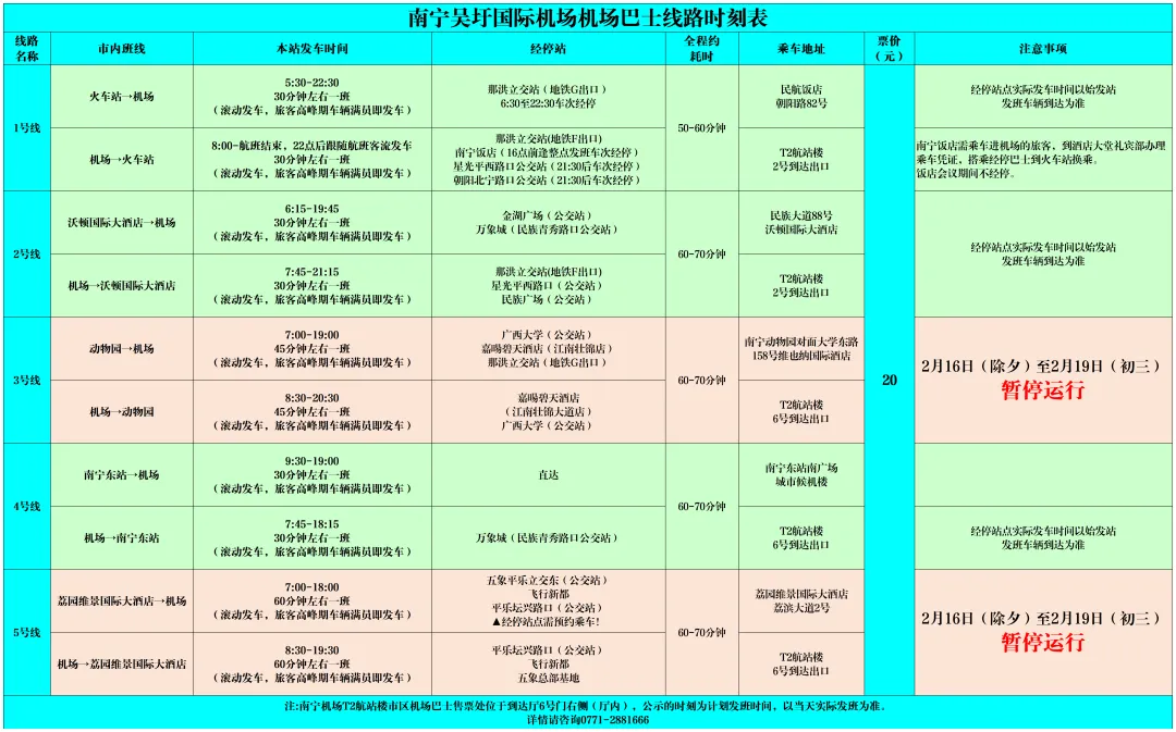2026年2月16日(除夕)至2026年2月19日(初三),南宁机场巴士3号线、5号线全线双向暂停运行,2月20日(初四)恢复运行。