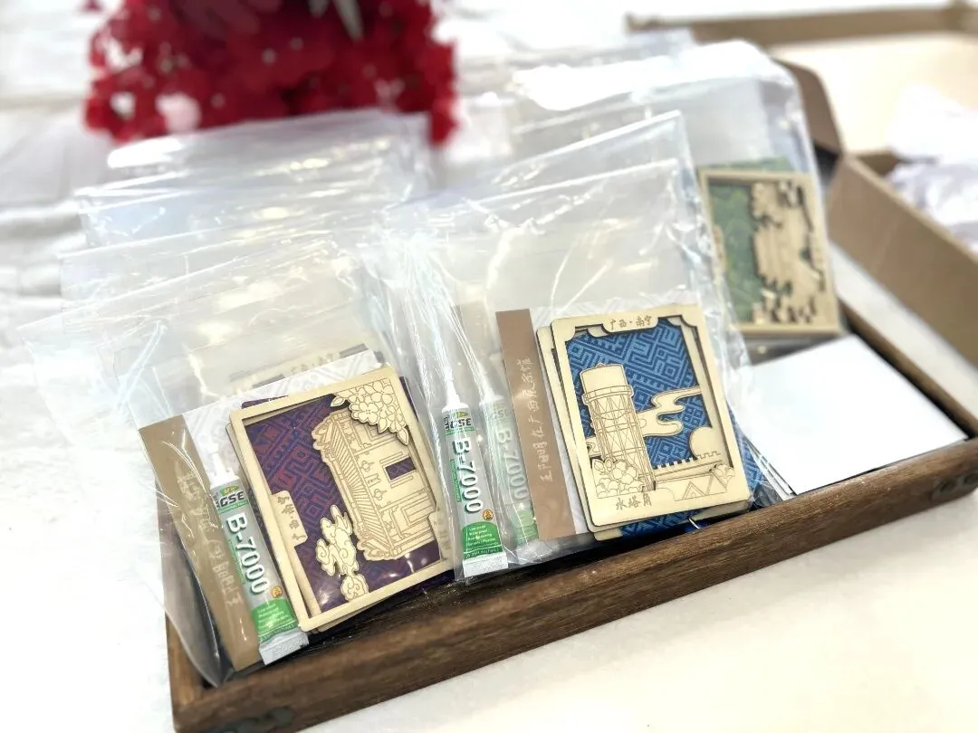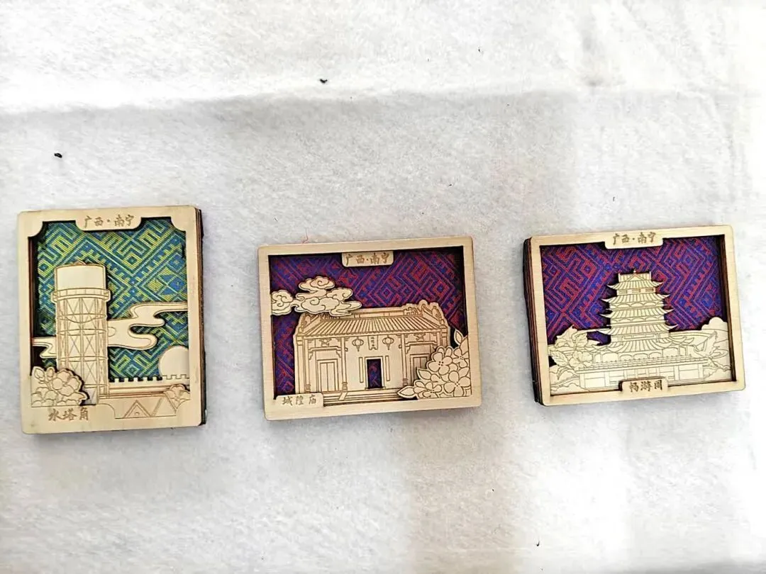 壮锦冰箱贴:作为广西非遗瑰宝,壮锦以色彩斑斓的菱形回纹、太阳纹为灵感,青年们一针一线勾勒纹样,将壮族人民对丰收、光明的期许绣进方寸磁贴中。成品不仅背面强磁稳固,更藏着“好运常伴”的美好寓意,成为厨房里的文化点缀。