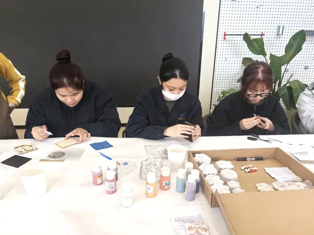 活动中,青年职工们暂时放下忙碌的工作,专注于指尖的创作,时而交流技巧,时而分享趣事,欢声笑语间拉近了彼此的距离。一张张专注的脸庞、一件件充满巧思的作品,不仅承载着对新春的美好期盼,更凝聚着南宁机务段青年职工的向心力与归属感。“平时工作节奏快,这样的DIY活动特别解压!亲手做的壮锦冰箱贴,贴在家里既能装饰又能想起同事们一起创作的快乐。”刚完成作品的青年职工小李说道。