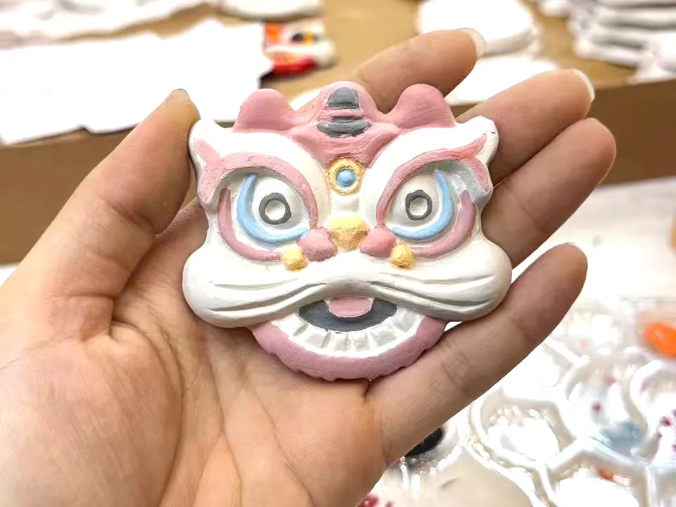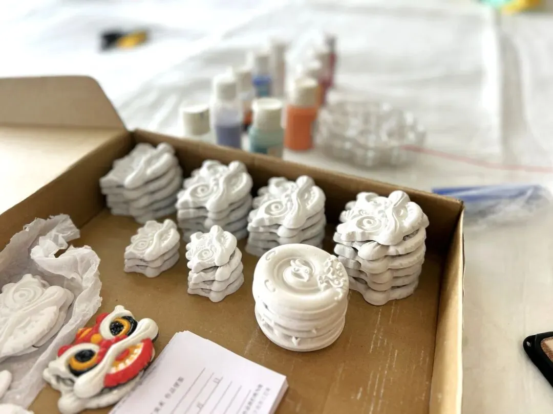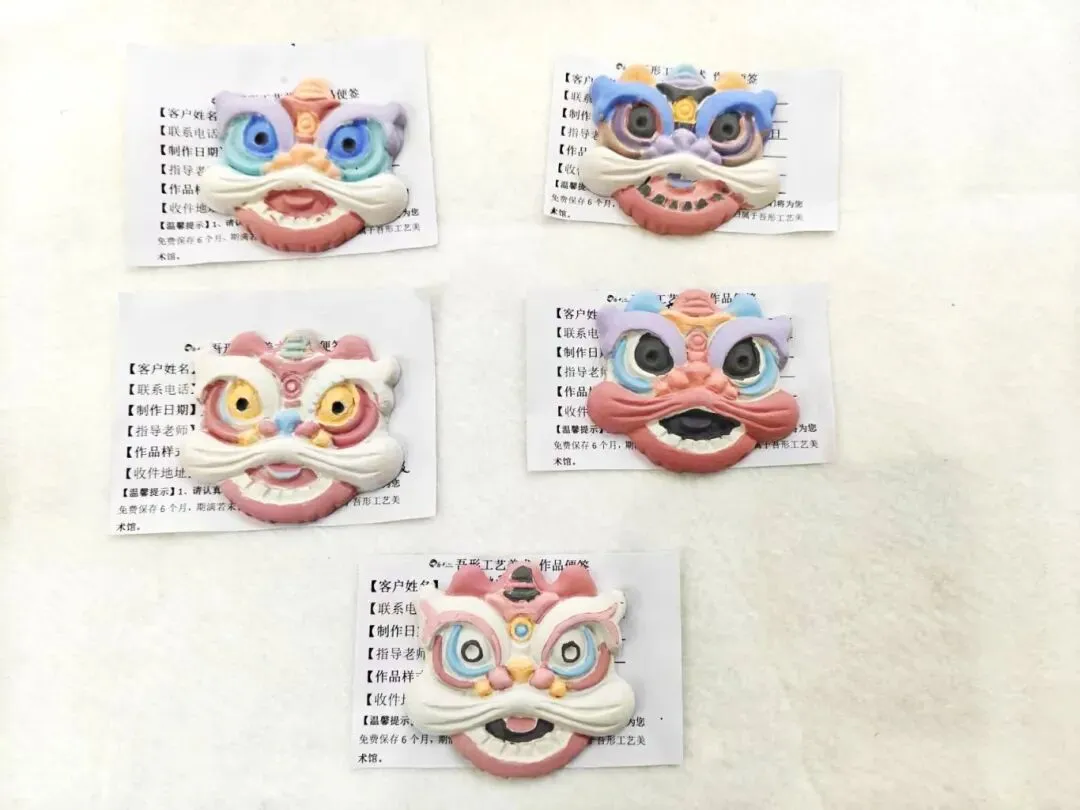醒狮冰箱贴:红橙黄黑各色醒狮灵动可爱,头顶的葫芦、珠宝纹样暗藏“福禄吉祥”“招财进宝”的祝福。青年职工细心描绘狮鬃、点缀纹饰,让这尊传统民俗中的“守护神”,化作守护日常的暖心信物。