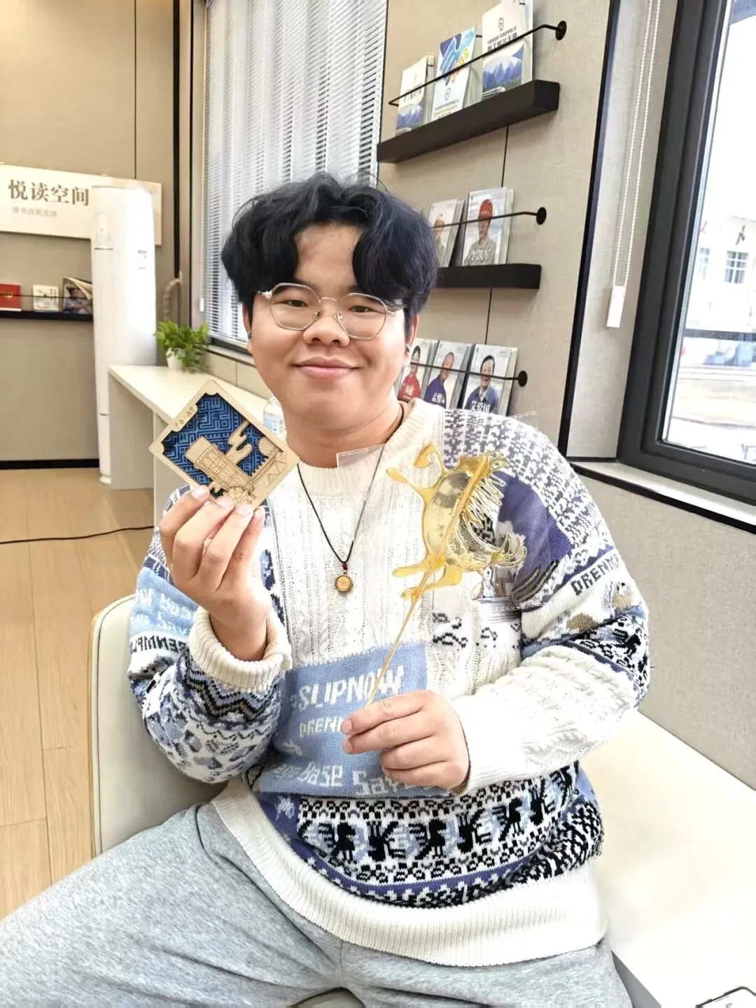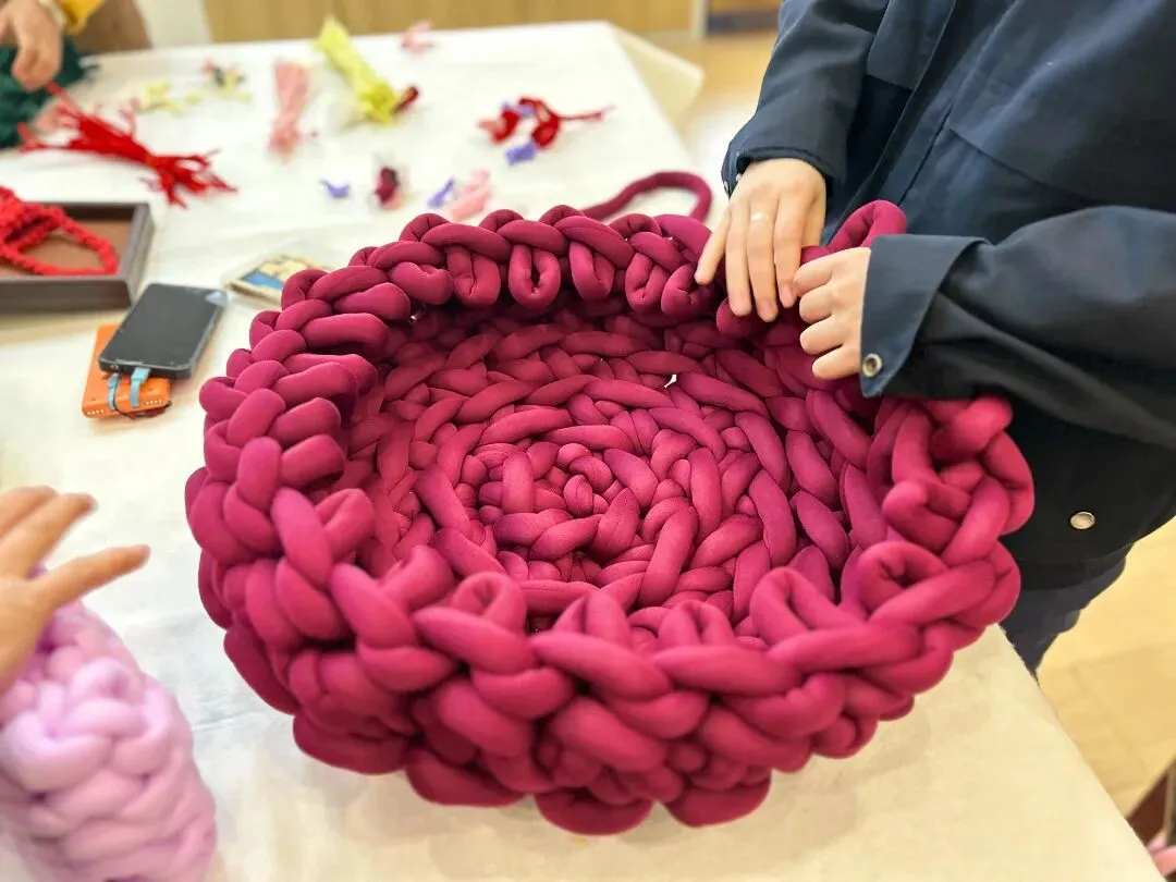 冰岛毛线编织:超粗羊毛线柔软亲肤,在指尖缠绕成抱枕、围巾、小挂饰。大家围坐一团互帮互助,从“一团乱麻”到 “初见雏形”,在经纬交错间释放工作压力,编织出属于铁路青年的温暖联结。