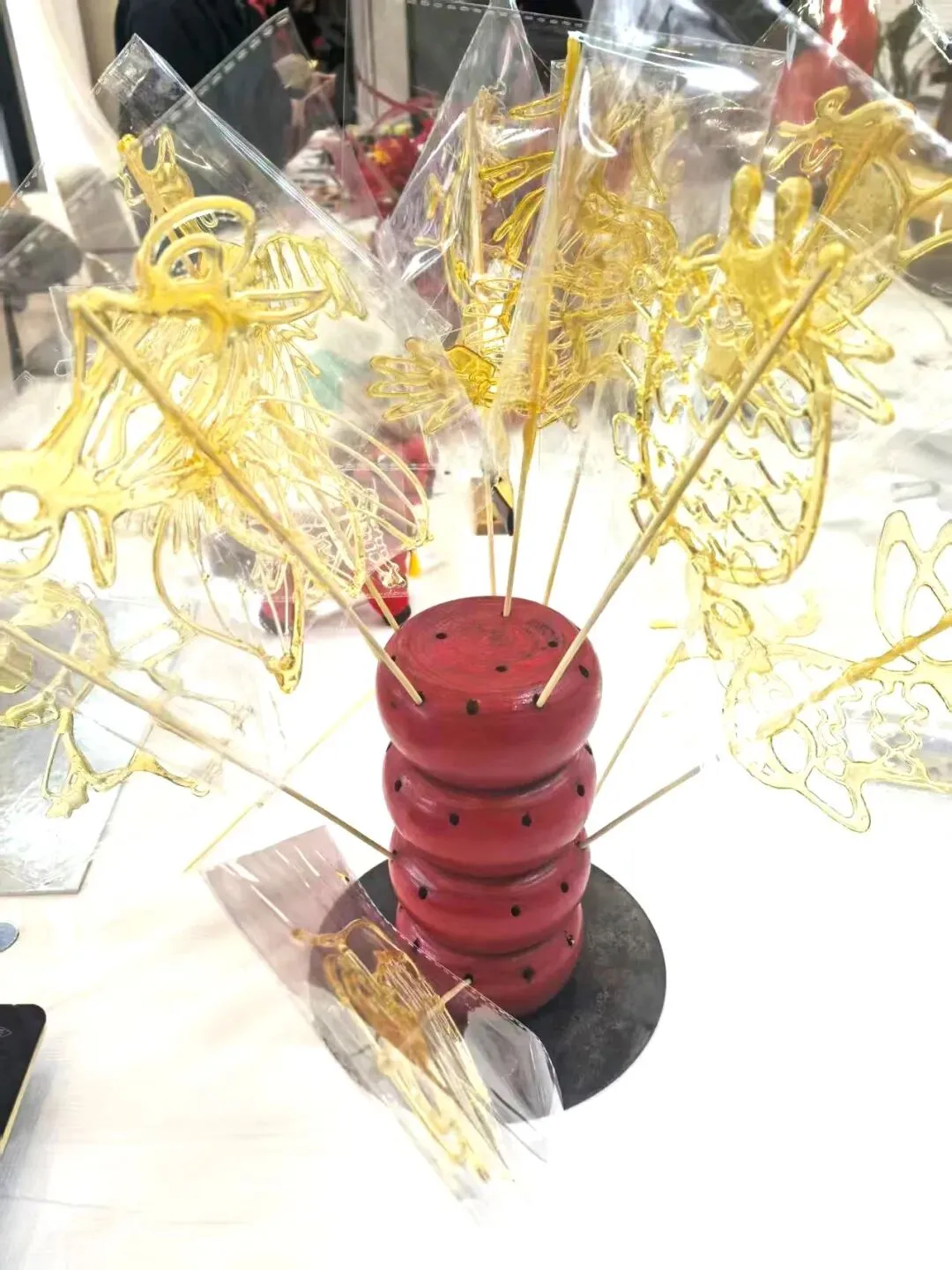 非遗糖画:以糖为墨,以勺为笔,非遗师傅现场指导青年们绘制龙、凤、生肖等吉祥图案。滚烫的糖浆在铁板上流淌凝固,甜香四溢间,不仅复刻了童年记忆里的甜蜜,更让传统手工艺在年轻一代手中焕发新生。