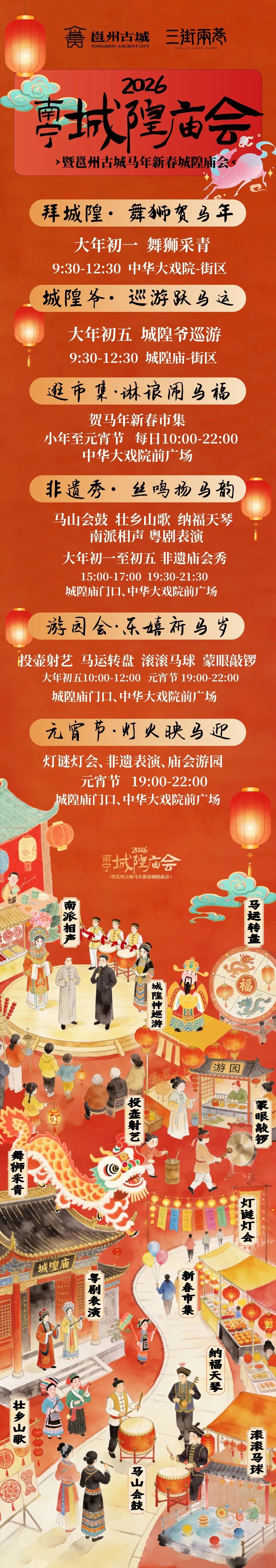 南宁的年味藏在山水灯海、老街烟火和园林庙会里。收下这份南宁新春游玩攻略,让你高效打卡绿城的新春盛景!地点:青秀山东区(叶子花园、音乐大草坪等七大区域)门票:白天20元/人,夜场灯会48元/人,建议提前在官方公众号、美团等渠道购票。核心亮点:白天可以逛郁金香花海、兰园,到观音禅寺祈福。晚上观赏灯会,赏灯建议从东门进入青秀山,18:30亮灯后观赏最佳。43组大型主题灯组,马年 “光驰八骏” 水面灯组灵动磅礴,“双凤和鸣” 融入壮乡绣球鼓乐元素,还有15米高仿真霸王龙、700架无人机星空秀、非遗打铁花、火艺飞天壶轮番上演。建议穿舒适步行鞋,可乘景区观光车代步。交通:地铁3号线青秀山站B口(至西门);地铁1号线到凤岭站,打车到青秀山东门(约11元);公交W34路、旅游2路至青秀山东门站。交通:地铁1/2号线朝阳广场站,步行5分钟到水塔脚附近,即达水街历史文化街区入口。核心亮点:打卡红灯笼长廊、黄金树、春节集市,有NPC巡游、变脸秀等展演,还能解锁VR逛展。邕州古城·三街两巷2026南宁城隍庙会:感受邕城烟火核心亮点:免费开放,白天可以逛步行街、城隍庙,参观各个历史展馆,感受骑楼文化;晚上可以逛新开放的中山路夜市,感受邕城烟火。春节期间,三街两巷、城隍庙还有多个民俗活动,详见下方海报。推荐路线:①折叠时光游线:钟鼓楼 → 南宁建制博物馆 → 邓颖超纪念馆 → 城隍庙 → 人民剧院 → 仓西门 → 王阳明在广西展示馆 → 新华路水塔 → 两湖会馆 → 新会书院 → 老南宁记忆陈列馆。②街区漫步游线:中山路→民族大道→银狮巷&金狮巷→当阳街→解放路→水街必吃清单:老友粉、卷筒粉、酸嘢、糯米饭、粉饺、烤生蚝、炒螺、柠檬鸭等。小贴士:尽量错峰就餐,避免排队;注意个人财物安全;吃完可沿邕江步道散步消食。交通:乘坐地铁3号线至五象湖站(A出口)/乘坐地铁2号线至金象站(A出口),换乘B02路快速公交到“园博园站”下车,或者从地铁站直接打车到南宁园博园。核心亮点:五福闯关趣庙会,免费领集章卡赢礼品;丝路花海(30 万株金鱼草)、广西园紫罗兰浪漫绽放;萌宠巡游(水豚、梅花鹿等);国风飘雪秀营造冬日氛围;大年初二至初六,每日19:00起有主题烟花秀,搭配非遗展演与新春市集。游览建议:预留一整天,上午逛花海、集福闯关,下午逛民俗市集,晚上看飘雪与烟花;可夜宿园区木屋/太空舱。南宁之夜・马上有戏 新春仙游记: