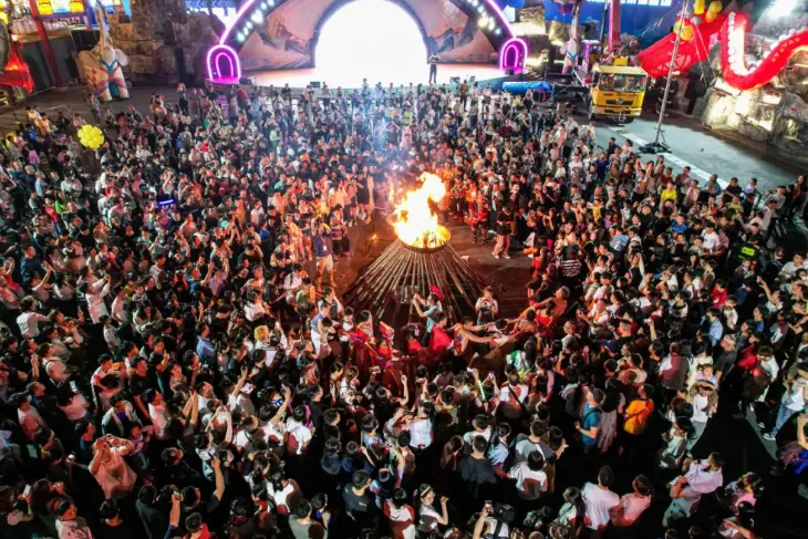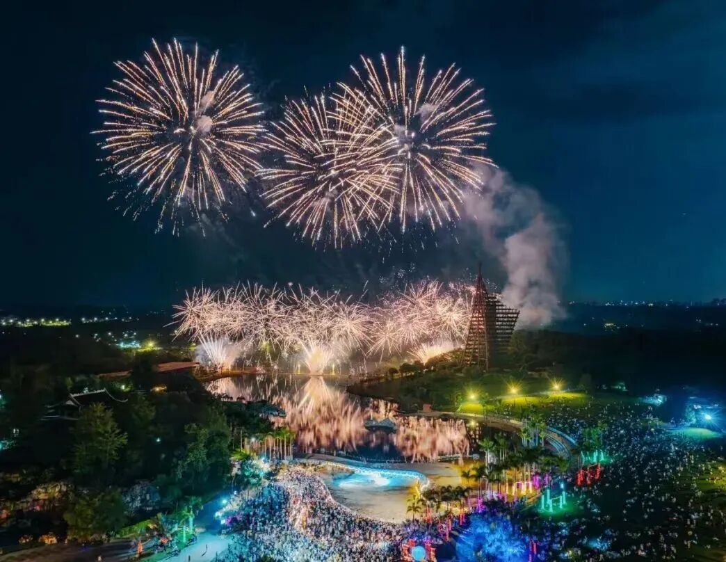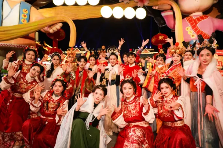 灯海盛宴(二期):自贡非遗团队打造48组主题灯组,30米山顶巨型天马灯、“壮乡儿女”“刘三姐对歌台” 壮风灯组,湖面倒影流光溢彩;18:30亮灯,适合汉服拍照。初一至初三(2.17-2.19):醒狮送瑞街头巡游,锣鼓喧天初四至初六(2.20-2.22):《百越神谕》高跷大戏首秀(布洛陀、密洛陀领衔,麼乜萌神互动)、天女散花双仙贺岁神仙天团NPC全天打卡,福禄寿喜财五路神仙送福袋;壮乡竹竿舞、电音非遗摊舞轮番上演。美食与体验:150多家商铺,老友粉、酸嘢、烤猪蹄等广西特色 + 全国小吃;非遗手作工坊可体验壮锦编织、绣球制作;萌宠乐园(二期)水豚、矮马、羊驼互动。火秀狂欢:对歌广场每晚20:00有火艺飞天壶、打铁花表演,火光与灯光交映。