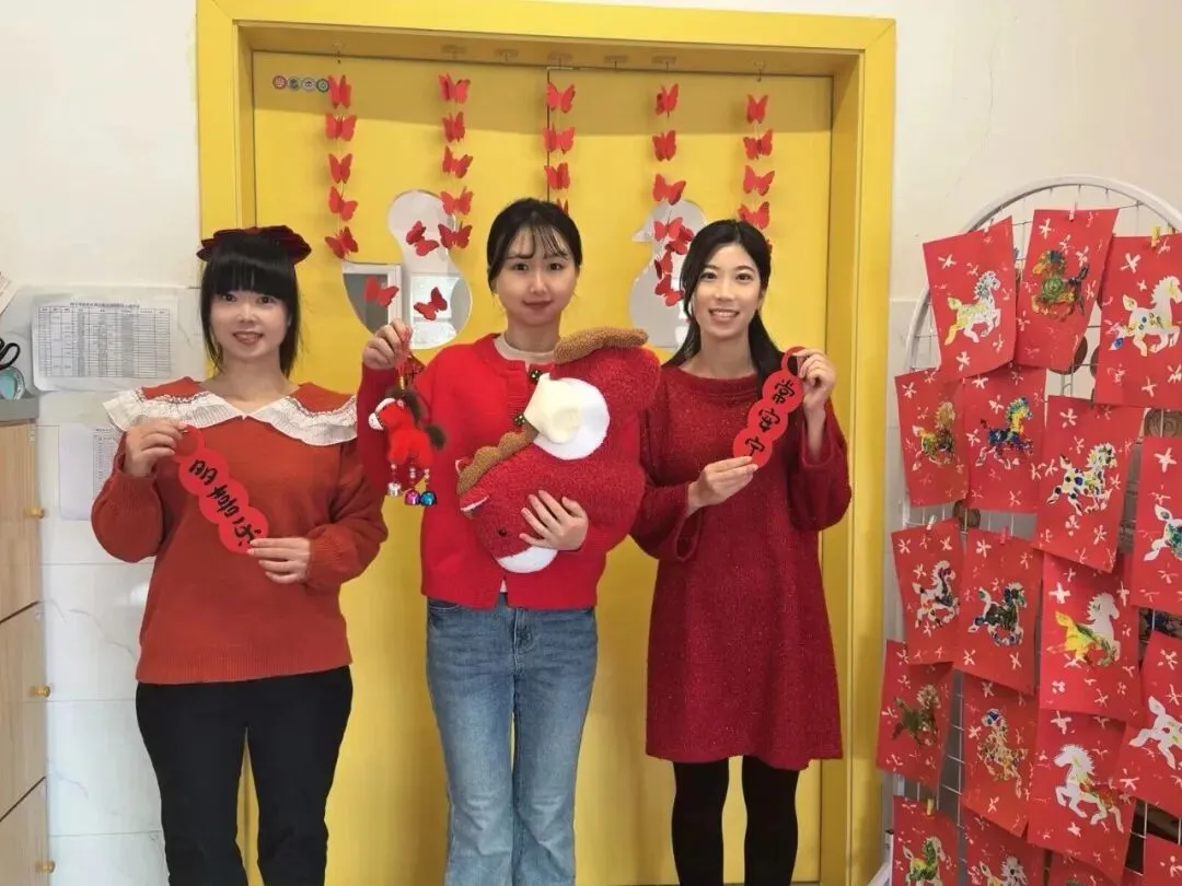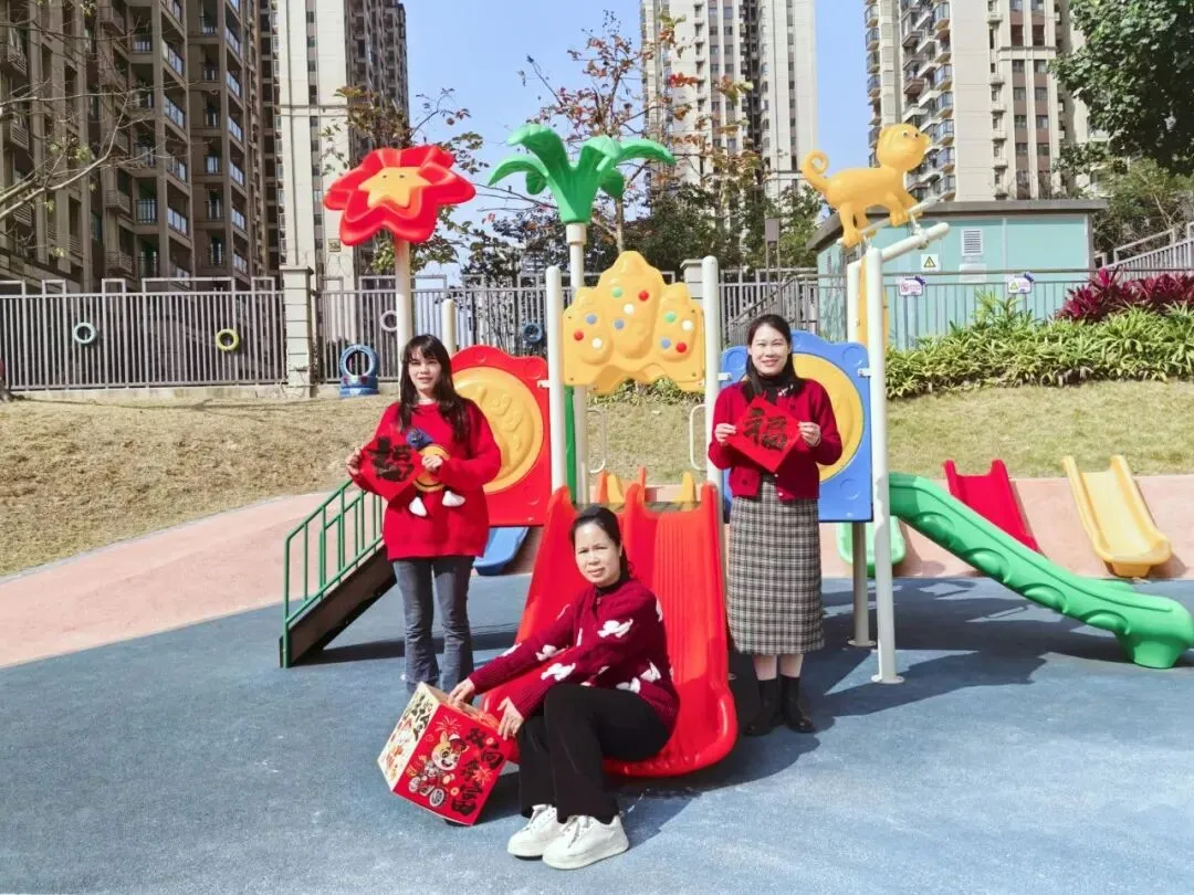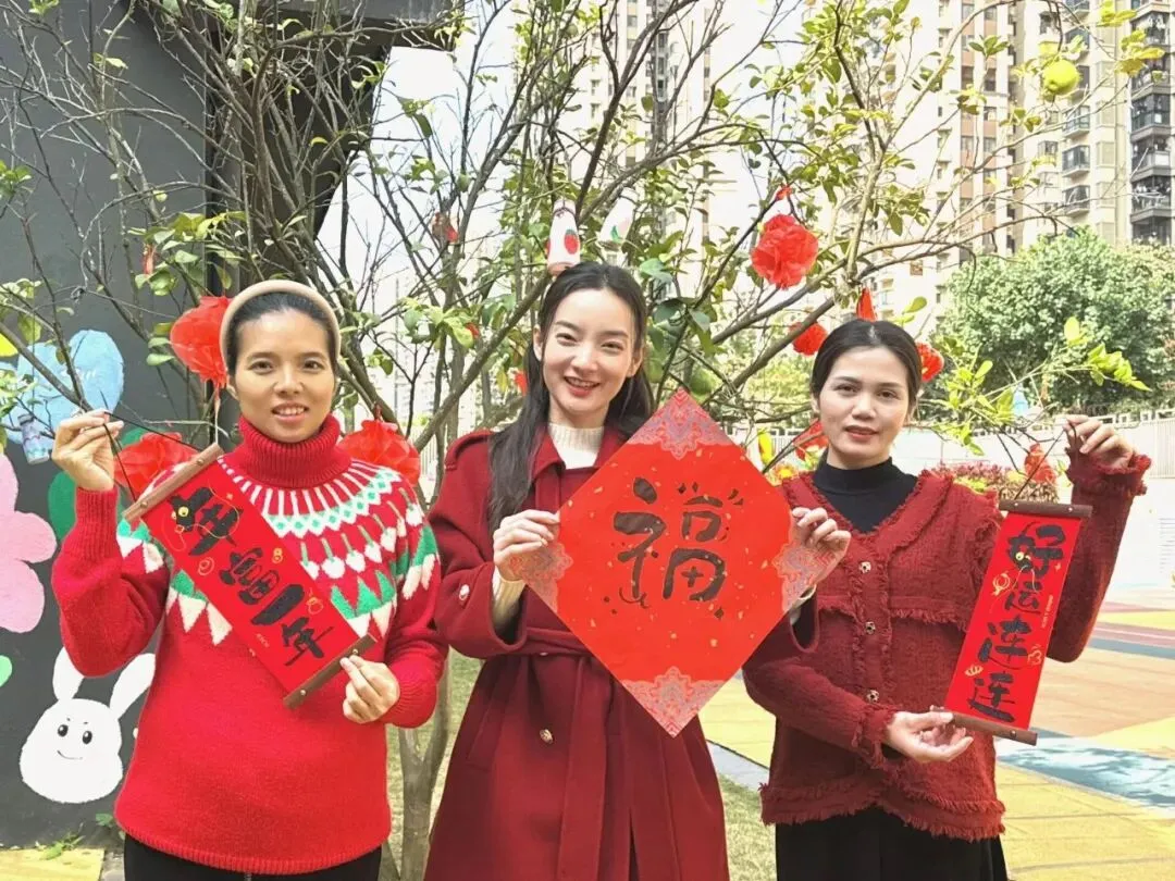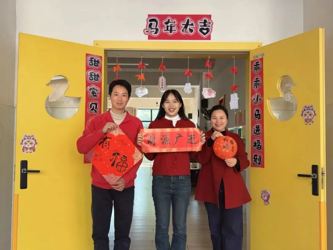 老师们身着喜庆红装,或在色彩斑斓的滑梯旁手持福字,或在教室门口举着吉祥挂饰,每一张笑脸都温暖如春。这抹专属锦玉的“中国红”,是年味,是暖意,更是对孩子们最真挚的守护。