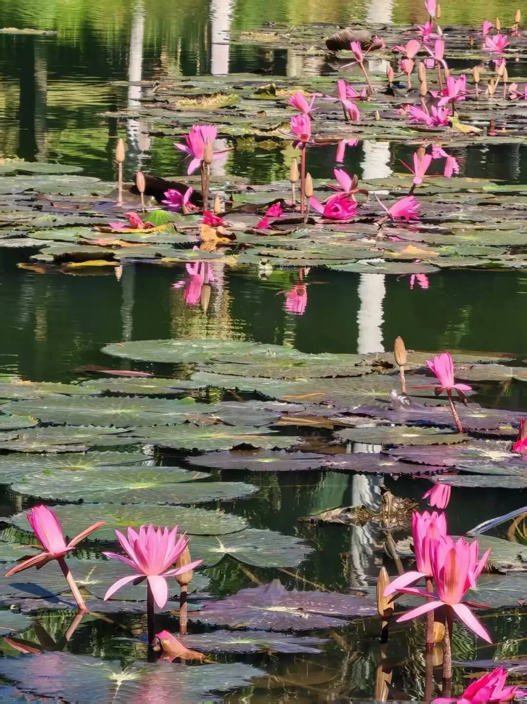 漫步至湖边,又是另一番景致。澄澈的水面上,睡莲静静绽放,粉的、红的花瓣轻托着露珠,在阳光下泛着柔光。锦鲤成群结队地穿梭于莲叶间,红的、白的、黄的身影灵动活泼,引得游人驻足投喂。“见到者好运来”,看着这满池欢腾的鱼儿,仿佛真能沾染一身喜气,将烦恼抛诸脑后。