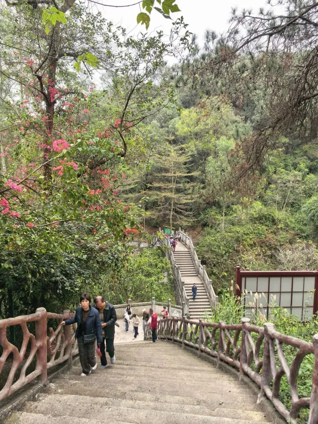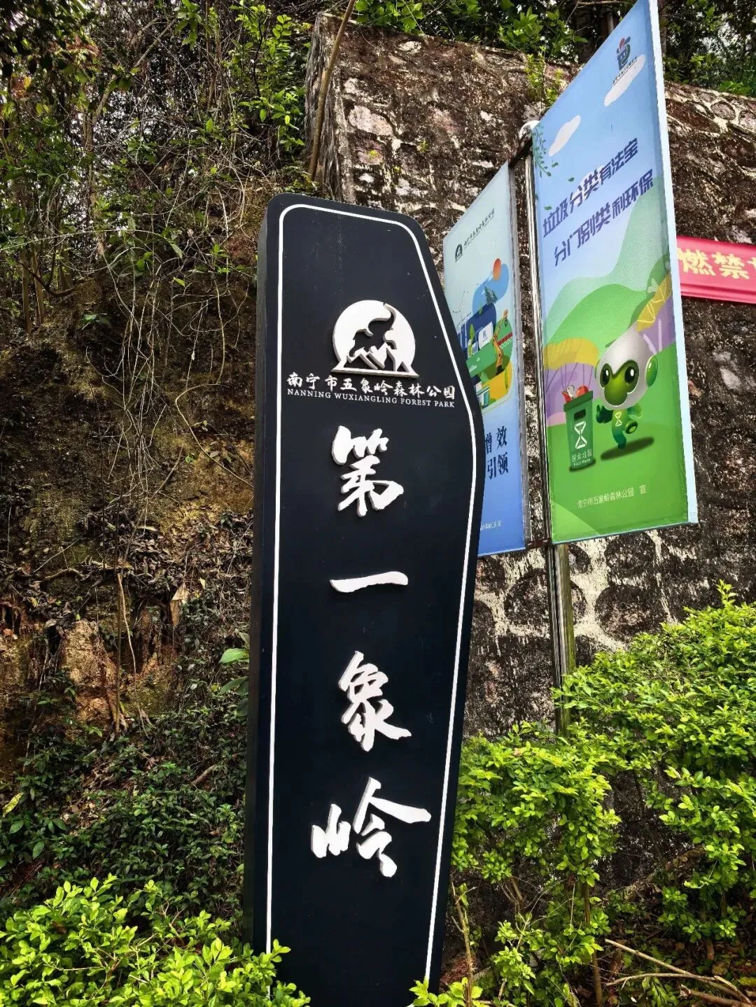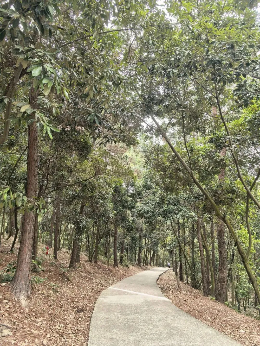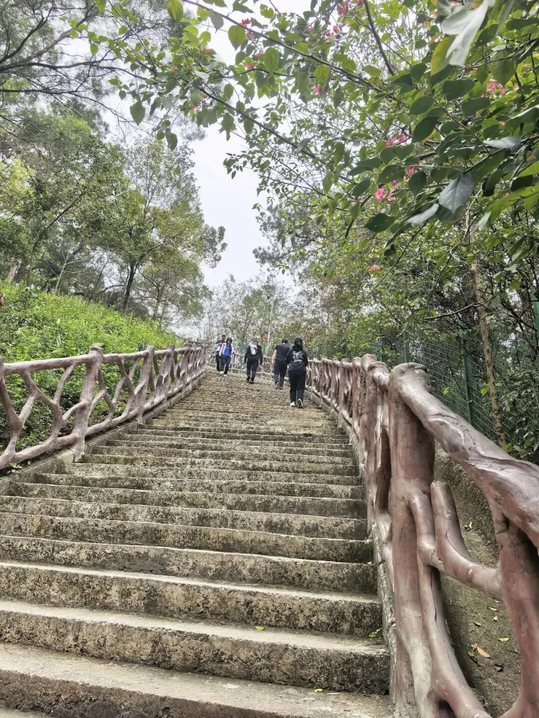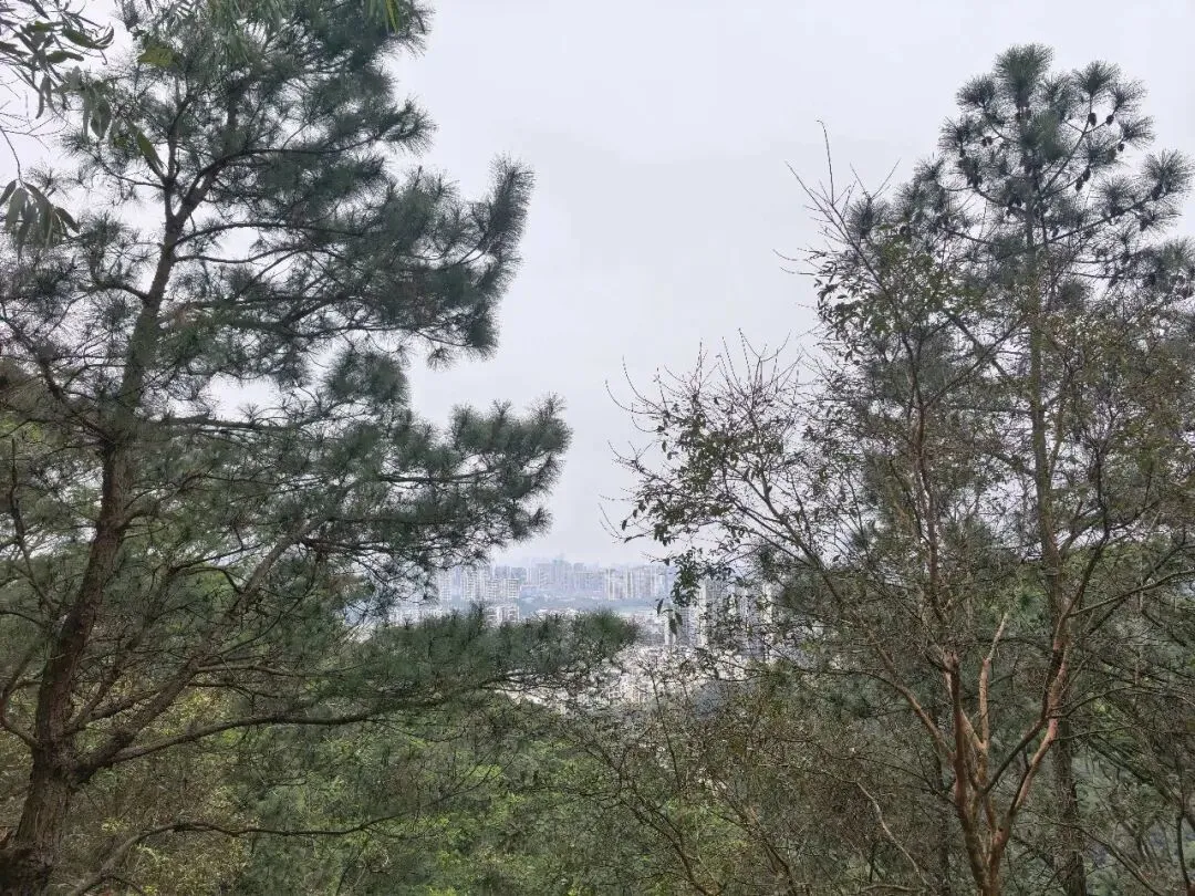 入口不太显眼,在江南建设路边的一个小缺口处,竖着一个朴素的牌子。走过一段两三百米挂满小灯笼的路,就见一座拱桥横在山涧上。栏杆上雕着憨憨的象脑袋——圆眼睛,大耳朵,长长的鼻子。桥下没有水,只有干涸的溪石和杂草,但可以想见雨季来时,山涧潺潺的样子。台阶陡然竖起,一级一级往上摞,抬头望去,坡度直逼九十度直角。我扶着栏杆喘气,心跳还没稳下来,身后却上来一家人——有的抬着露营装备,折叠桌椅;有的抱着野餐垫,有的提着食物和大桶矿泉水;孩子们蹦蹦跳跳……一个刚学会走路的小娃娃,穿一身红袄,像个移动的小灯笼。他挣脱妈妈牵着他的手,两只小腿努力地往上抬,红袄在山道上一点一点地往上挪,看得人心都软了。但在山道上遇见,却觉得格外鲜艳——大约是山野的背景把它们衬出来了,紫红的、粉白的,一蓬一蓬地探出来,像是山在跟你拜年。不是北方那种笔直的松,是南方的马尾松,树形舒展,枝干虬曲。低头看,地上落满了松塔,圆鼓鼓的,鳞片饱满地张着,像一个个小灯笼。这是广西最常见的树了,高而瘦,树皮一片一片地剥落下来,露出光滑的浅白色树干,泛着淡淡的光。我站在那儿看了好一会儿——这景象竟我想起东北的白桦林,想起新疆禾木村边那些银白色的树干。步道是简单修过的,水泥路面平平整整、干干净净,每隔一段就有路牌,告诉你现在走到哪儿了。卫生间也有。推门进去,竟干净得让人意外——地面干爽,没有异味,墙上有免费取用的纸巾,烘手器居然也能用。松树的枯枝交错着,还有柯树、樟树,以及好多我叫不出名字的树。走到岭头水泥路结束的地方,就可以望见远处城市的高楼与街道。这大概就是“半开发”的好处——既有人替你指了路,又把大部分的野,留给了山自己。(二)