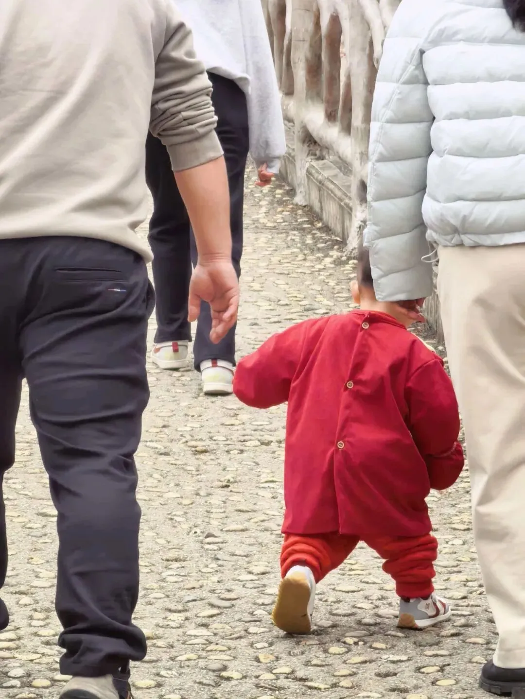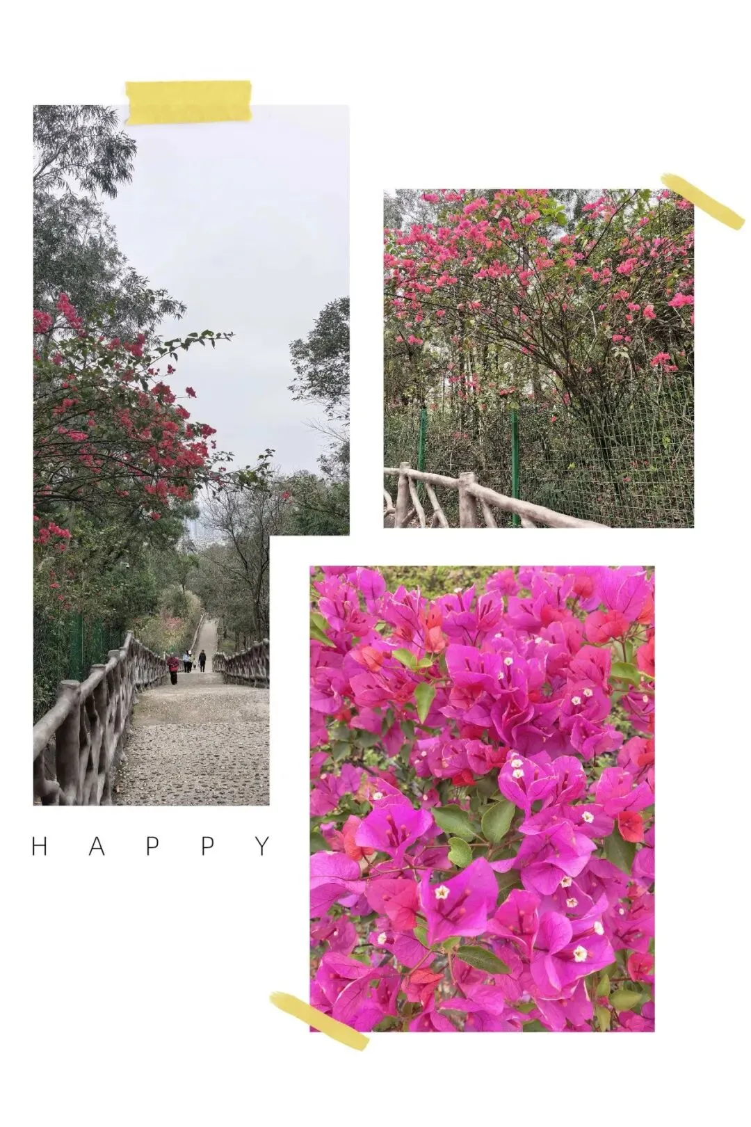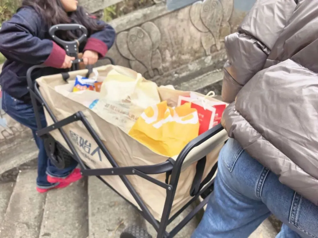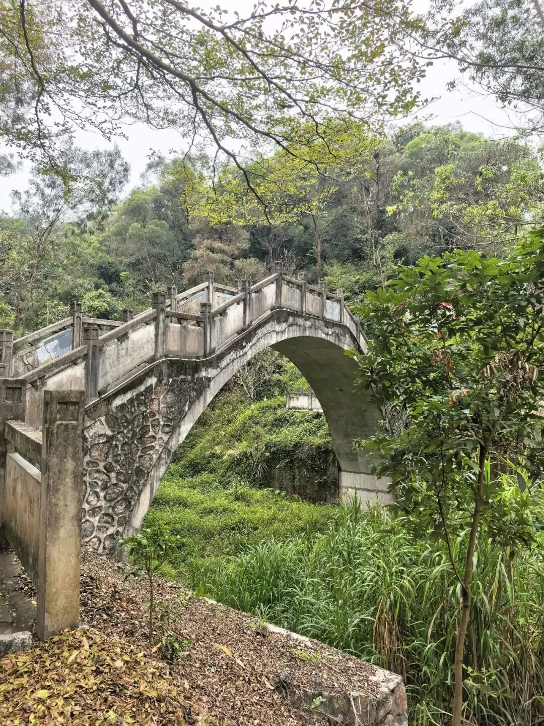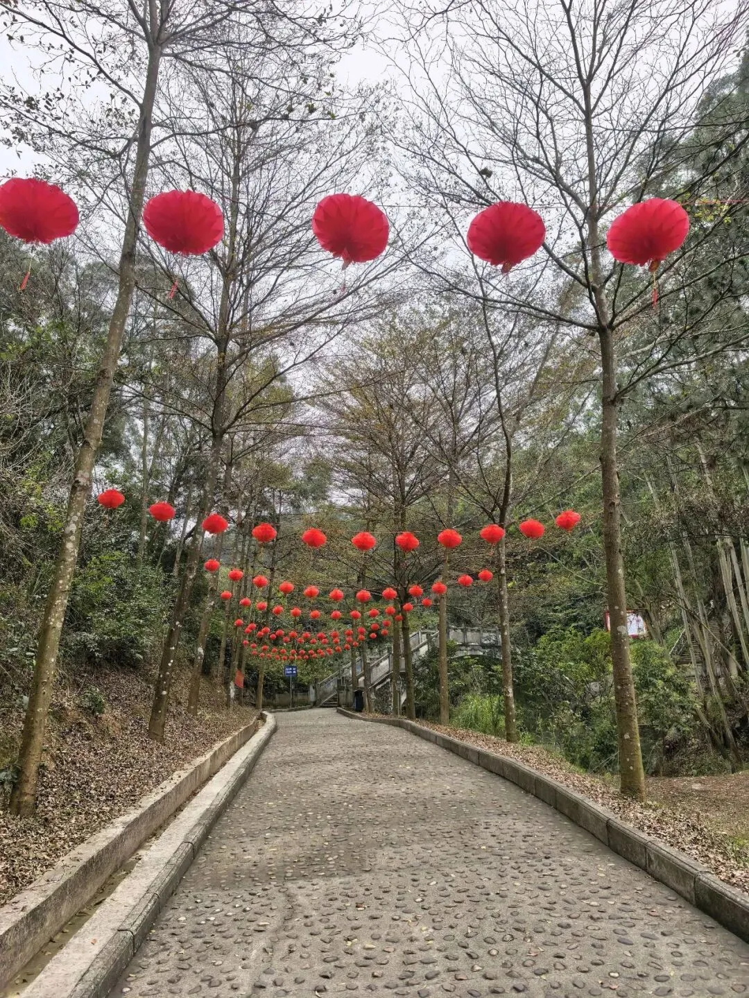 入口不太显眼,在江南建设路边的一个小缺口处,竖着一个朴素的牌子。走过一段两三百米挂满小灯笼的路,就见一座拱桥横在山涧上。栏杆上雕着憨憨的象脑袋——圆眼睛,大耳朵,长长的鼻子。桥下没有水,只有干涸的溪石和杂草,但可以想见雨季来时,山涧潺潺的样子。台阶陡然竖起,一级一级往上摞,抬头望去,坡度直逼九十度直角。我扶着栏杆喘气,心跳还没稳下来,身后却上来一家人——有的抬着露营装备,折叠桌椅;有的抱着野餐垫,有的提着食物和大桶矿泉水;孩子们蹦蹦跳跳……一个刚学会走路的小娃娃,穿一身红袄,像个移动的小灯笼。他挣脱妈妈牵着他的手,两只小腿努力地往上抬,红袄在山道上一点一点地往上挪,看得人心都软了。但在山道上遇见,却觉得格外鲜艳——大约是山野的背景把它们衬出来了,紫红的、粉白的,一蓬一蓬地探出来,像是山在跟你拜年。不是北方那种笔直的松,是南方的马尾松,树形舒展,枝干虬曲。低头看,地上落满了松塔,圆鼓鼓的,鳞片饱满地张着,像一个个小灯笼。这是广西最常见的树了,高而瘦,树皮一片一片地剥落下来,露出光滑的浅白色树干,泛着淡淡的光。我站在那儿看了好一会儿——这景象竟我想起东北的白桦林,想起新疆禾木村边那些银白色的树干。步道是简单修过的,水泥路面平平整整、干干净净,每隔一段就有路牌,告诉你现在走到哪儿了。卫生间也有。推门进去,竟干净得让人意外——地面干爽,没有异味,墙上有免费取用的纸巾,烘手器居然也能用。松树的枯枝交错着,还有柯树、樟树,以及好多我叫不出名字的树。走到岭头水泥路结束的地方,就可以望见远处城市的高楼与街道。这大概就是“半开发”的好处——既有人替你指了路,又把大部分的野,留给了山自己。(二)