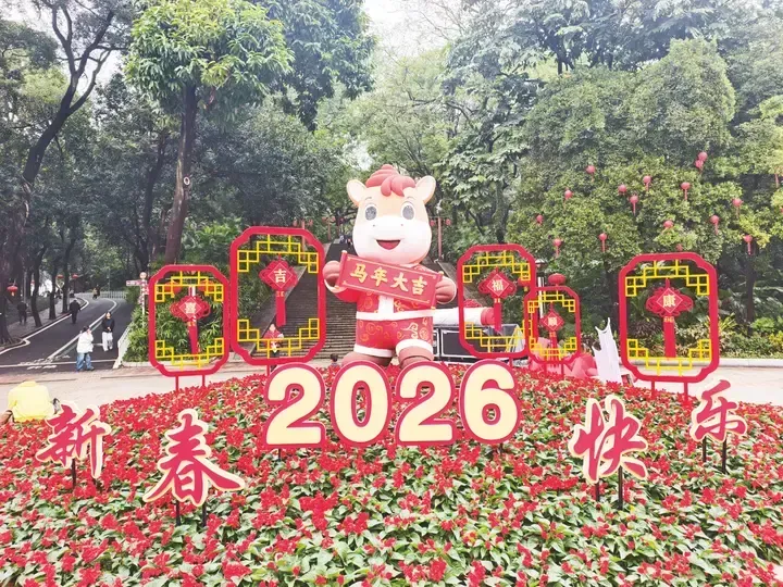 南宁市人民公园把马年祥瑞、生态巧思和人文雅韵揉进园景里,设置7大主题小品、缤纷花田盛景、红红火火的新春布置,还有超多文化活动轮番上阵,期待市民游客春节期间前去打卡。在南湖公园名树博览园入口,一组以壮锦马、红灯笼、祝福标语与时令花卉组合而成的景观尤为亮眼,其将生肖马年的文化符号与壮锦巧妙融合,既传递传统年味,又彰显浓郁的民族风情,吸引众多市民游客前来打卡。