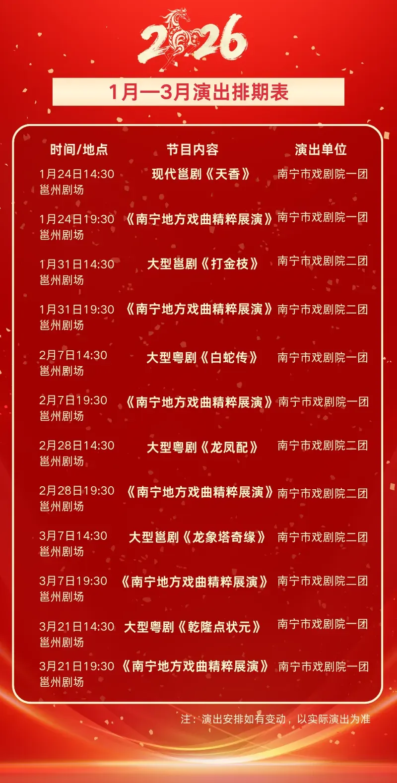 邕州剧场演出排期表。