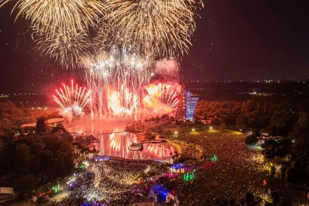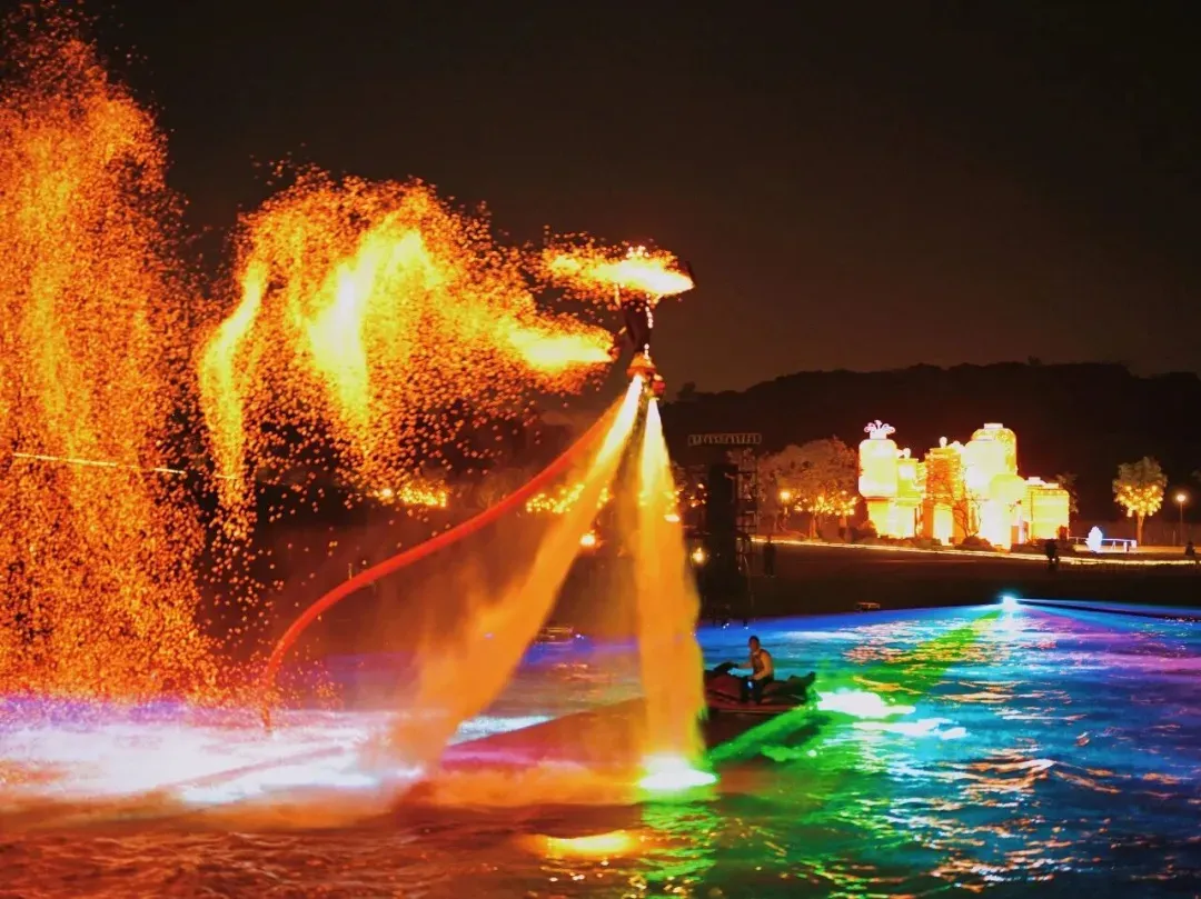 国家级非遗“打铁花”璀璨绽放,结合飞天舞狮、水上火艺秀,呈现一场惊心动魄的火光盛宴。
