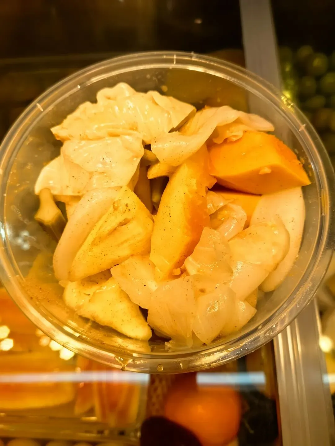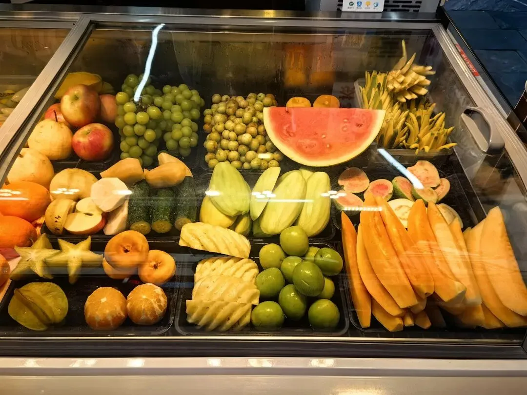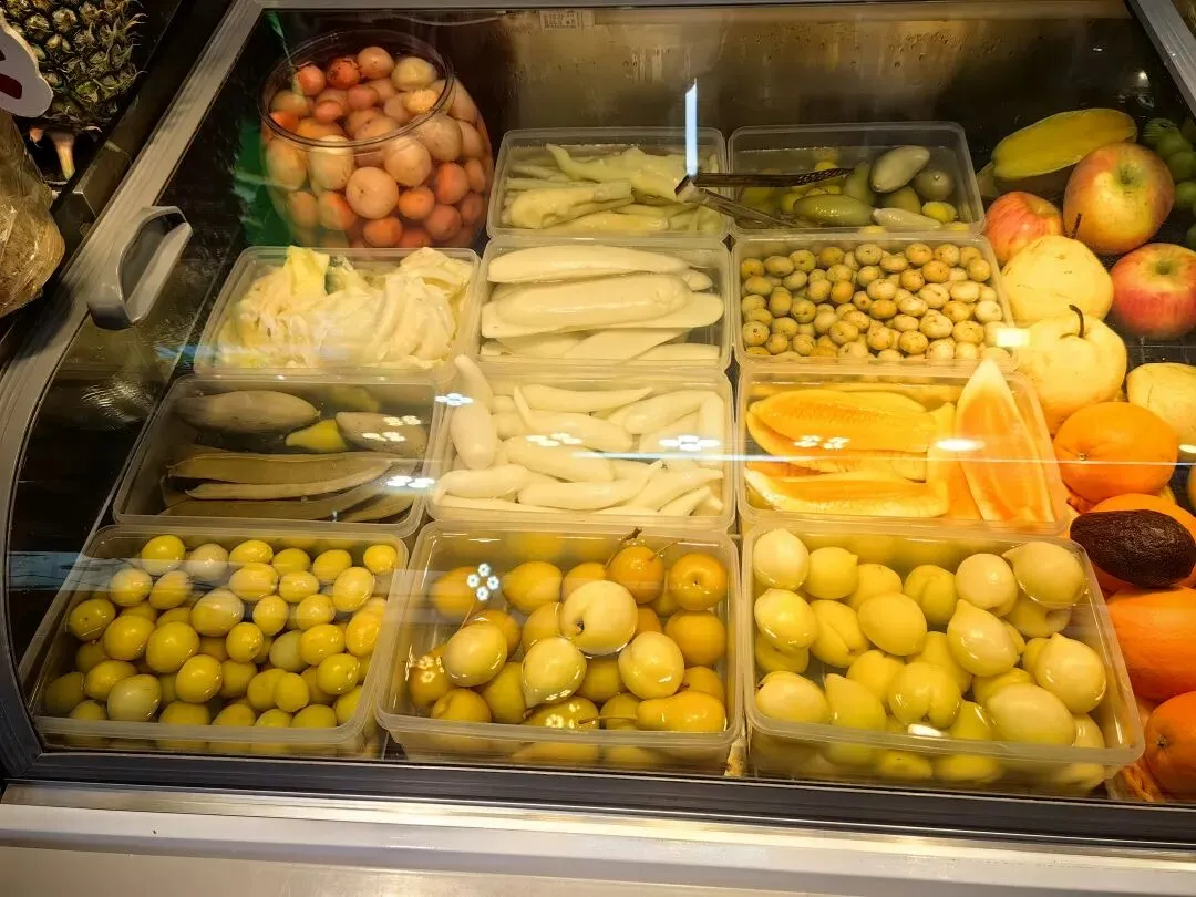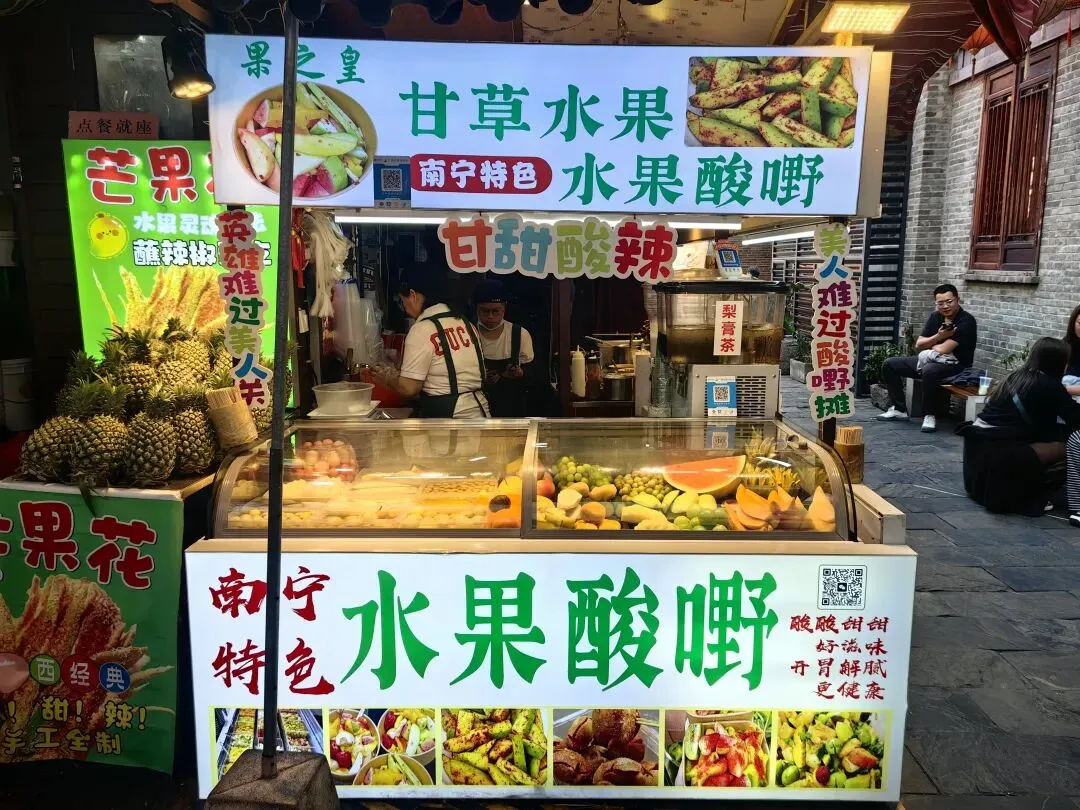 另外一种酸的吃法非常特别,就是被称为“酸嘢”的一种小吃。据说南宁酸嘢是历史悠久的传统小吃,以“生冷鲜脆、淡酸微甜”为特色。它采用当地木瓜、芒果、萝卜等时令果蔬,用米醋、辣椒、白糖等腌制而成(下图2)。现在为了适合多种人群的口味也做了一些改良,不仅有腌制的,而且还把一些新鲜的水果拌在里面,这样更加酸甜可口。民间流传“英雄难过美人关,美人难过酸嘢摊”的俗语,我们当然也要加入到这一行列(下图4),这一美味还入选了广西非遗名录。