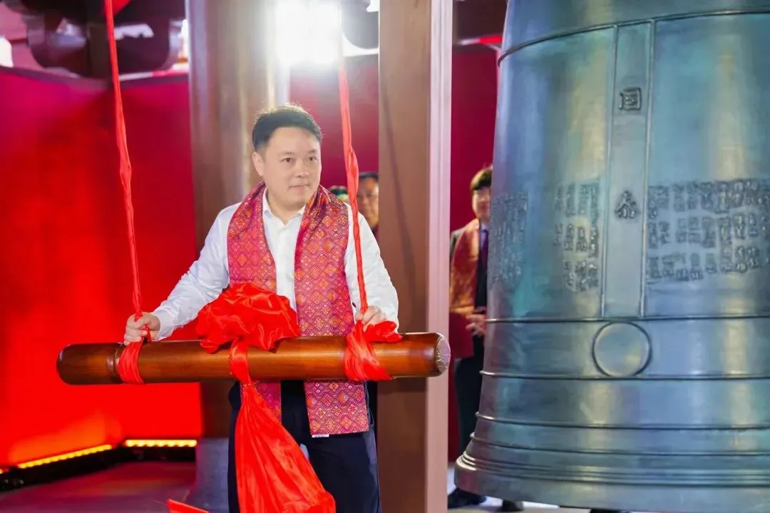 (广西动漫协会副会长、广西卡斯特动漫有限公司董事长梁文章在祈福活动撞钟)