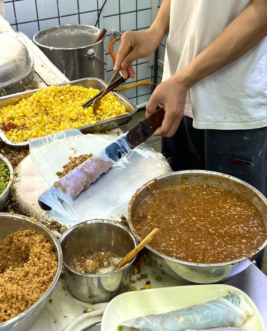 这家在江南万达的大唐卷筒粉 , 主打一个老友味 , 就是南宁人最熟悉的那个酸辣鲜香的老友味道 , 直接融进卷筒粉里了。 米皮是现摊的那种 , 薄但是糯唧唧的 , 咬下去不会散 , 整个口感非常扎实。