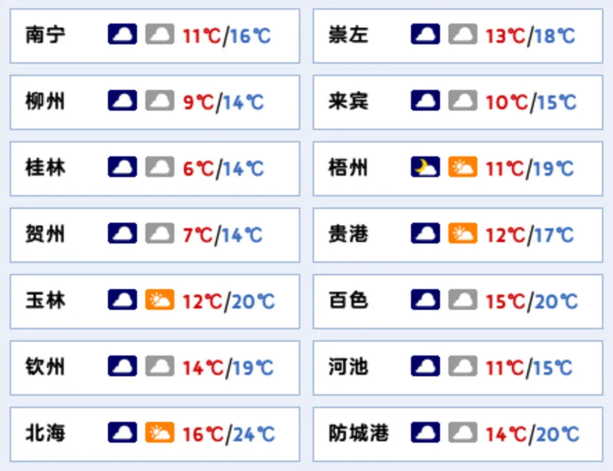 南宁市:阴天有分散小雨,东北风2级,最低气温11℃,最高气温16℃。