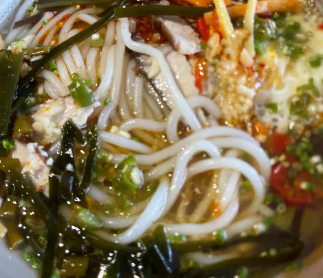 【兴安米粉·极简赏味】不用太复杂。进店喊一声“二两米粉”,老板烫好粉,给你切几片锅烧。关键在最后一步:自己去调料台,舀一勺酸豆角、撒点葱花,最重要的是淋上一勺特制的辣椒油。别加汤!千万别加汤!趁热拌匀,让每一根粉都裹上卤水,那才是地道的吃法。