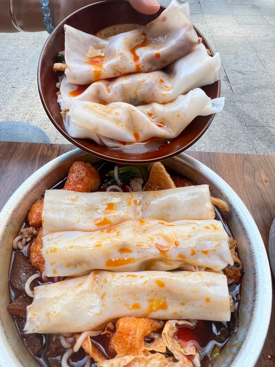 重头戏来了,一定要点他们家的螺蛳卷粉!看着那白白嫩嫩的卷粉铺在红油汤面上,还没吃口水就流下来了。卷粉皮薄软糯,把它们按进浓郁的螺蛳汤底里泡一泡,每一层都吸满了香辣的汤汁,一口咬下去,又滑又够味,真的好吃到想哭!