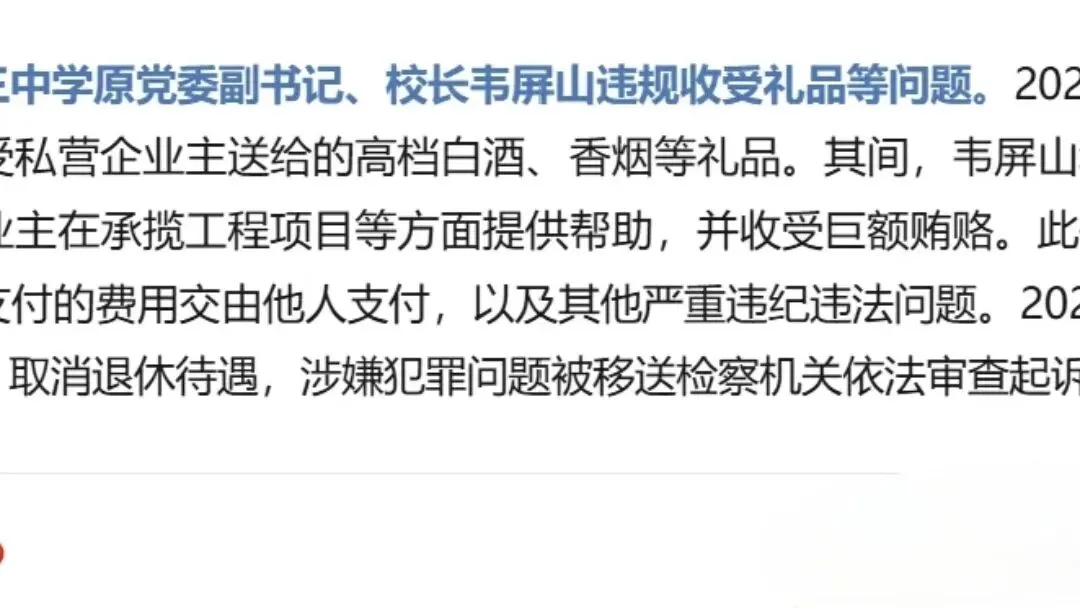 2026年2月15日,广西南宁市纪委监委发布违反中央八项规定精神典型问题的通报:南宁市第三中学原党委副书记、校长韦屏山违规收受礼品等问题。2022年至2024年,韦屏山多次收受私营企业主送给的高档白酒、香烟等礼品。期间,韦屏山利用职务便利,为前述私营企业主在承揽工程项目等方面提供帮助,并收受巨额贿赂。此外,韦屏山还存在将应由本人支付的费用交由他人支付,以及其他严重违纪违法问题。2025年11月,韦屏山被开除党籍、取消退休待遇,涉嫌犯罪问题被移送检察机关依法审查起诉。从通报来看,韦屏山担任校长的第二年,便和私营企业主暗通款曲,公私界限不分,收受他们呈送的高档白酒和香烟。作为投桃报李,当然利用手中的大权,为私营企业主承揽工程项目。