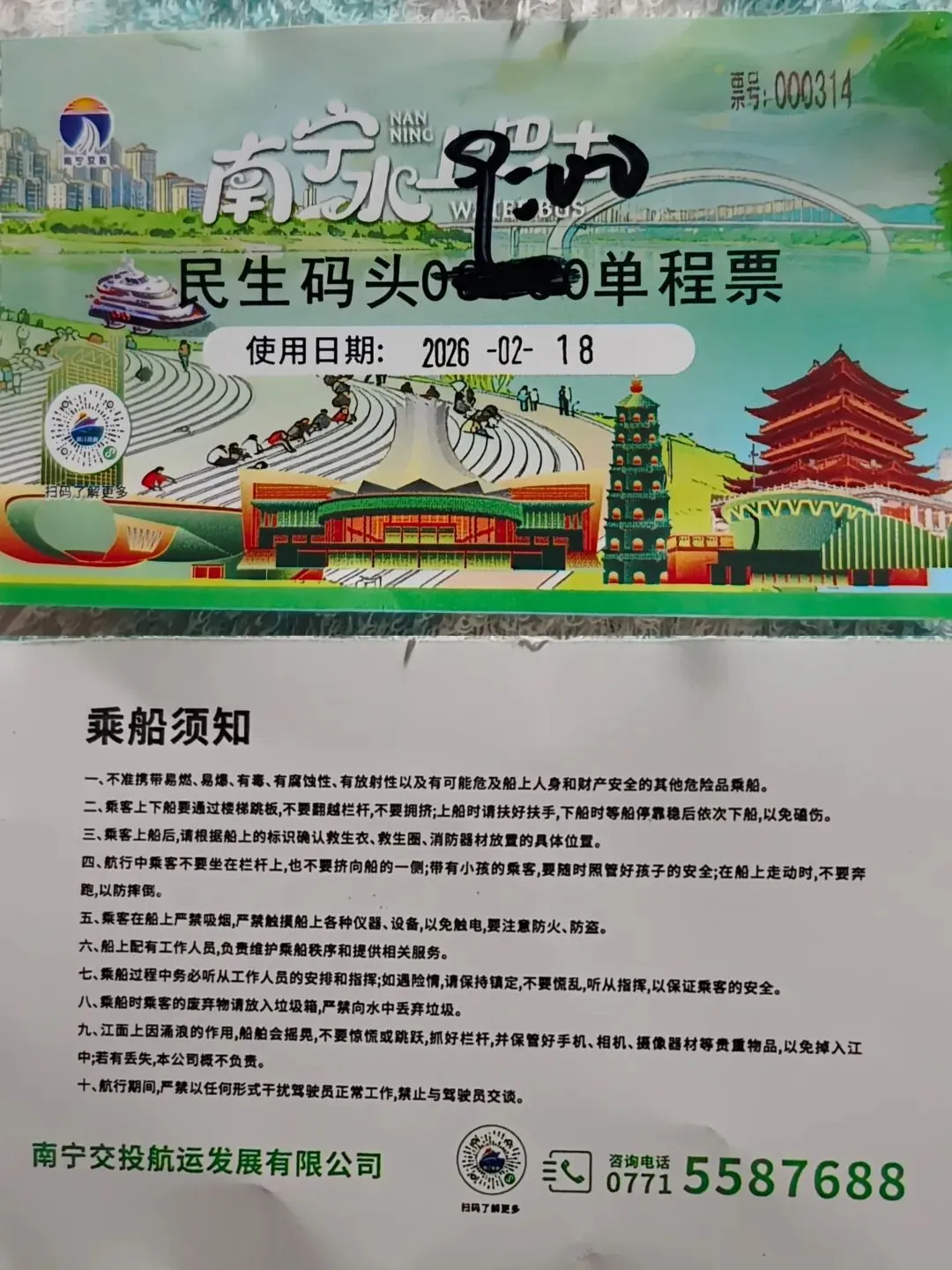 2026年马岁春节,南宁市党委、政府推出一条惠民政策,开通从民生码头到孔庙、从孔庙到民生码头双向的水上巴士游轮,票价:单程5元/人.次。