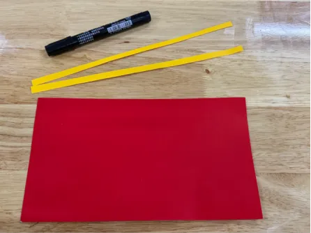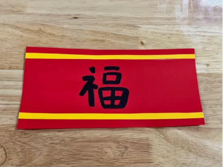 步骤四:准备红色、黄色卡纸以及记号笔,将黄色卡纸剪成两条条状贴在红色卡纸上面以及下面,中间写上福字