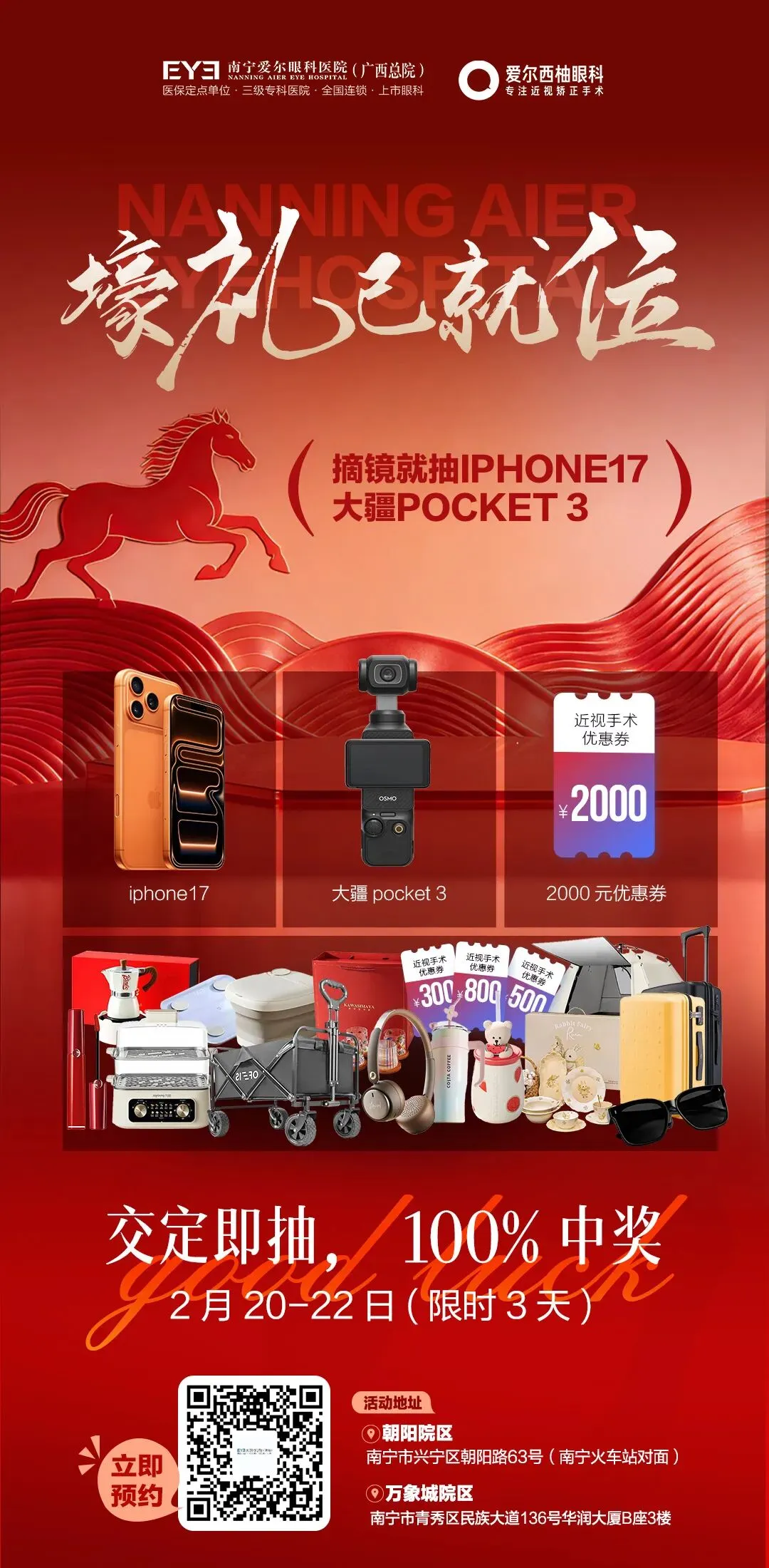 🔥 马年摘镜,豪礼拉满!2 月 20 日 - 22 日,限时 3 天,只要交摘镜定金,就能参与抽奖!不管是想做全飞秒 Pro 的学生党,还是备战参军 / 警校体检的热血青年,这波福利都能直接冲!