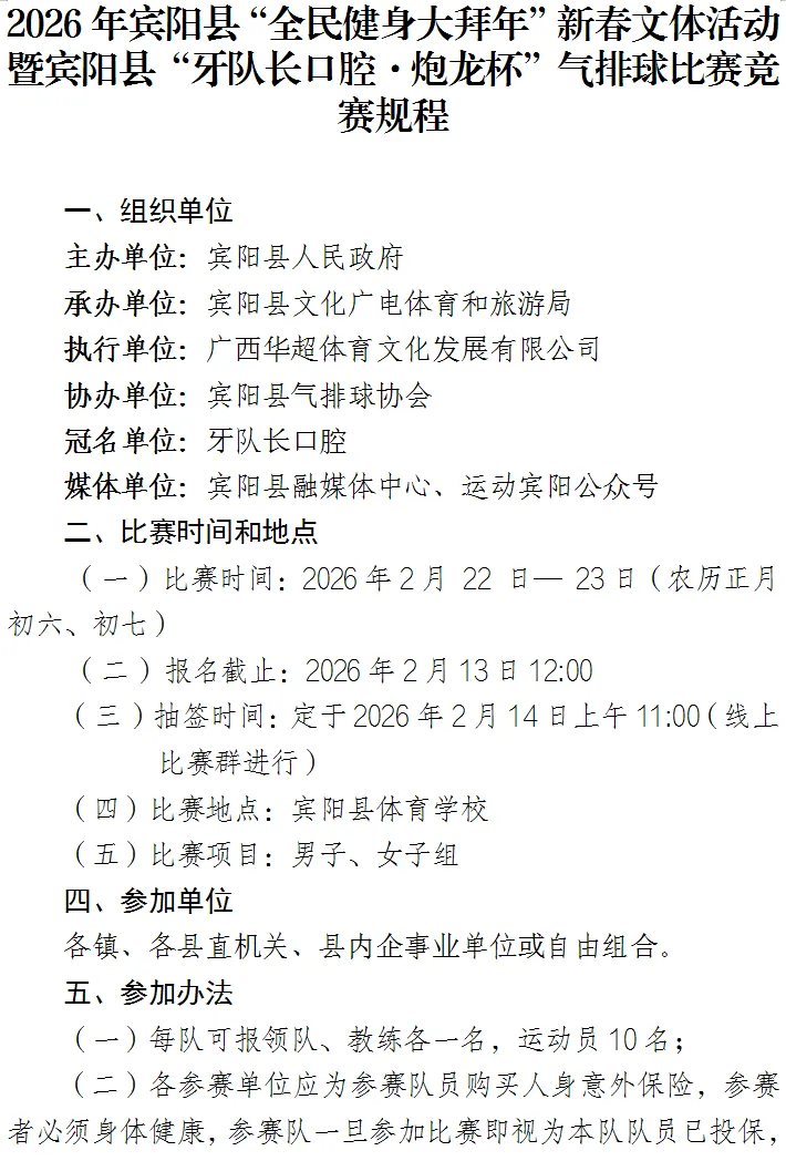 >【球讯】2026年广西南宁宾阳县“牙队长口腔·炮龙杯”气排球比赛竞赛规程(比赛时间:2.22-2.23)