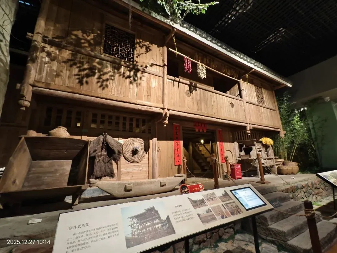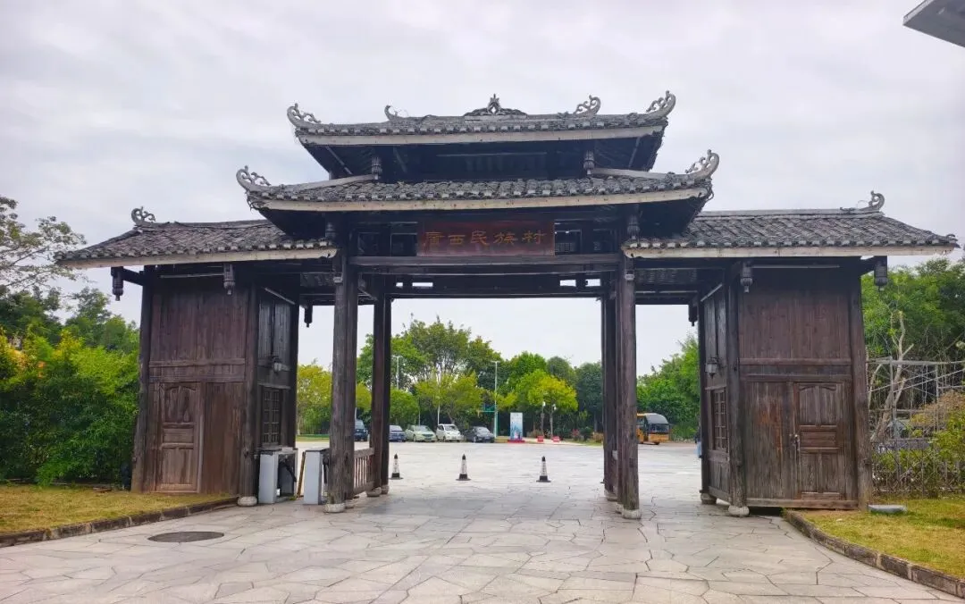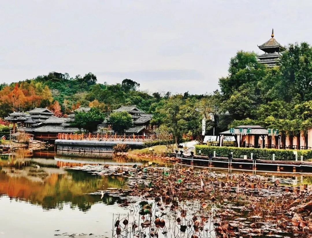 此外,博物馆外,还有露天民族村展示园,一比一 复原的侗族鼓楼、风雨桥、壮族干栏楼、瑶族竹楼等实景建筑,绿树流水环绕,但荷塘里仅有残荷,是沉浸式体验和拍照的绝佳去处。