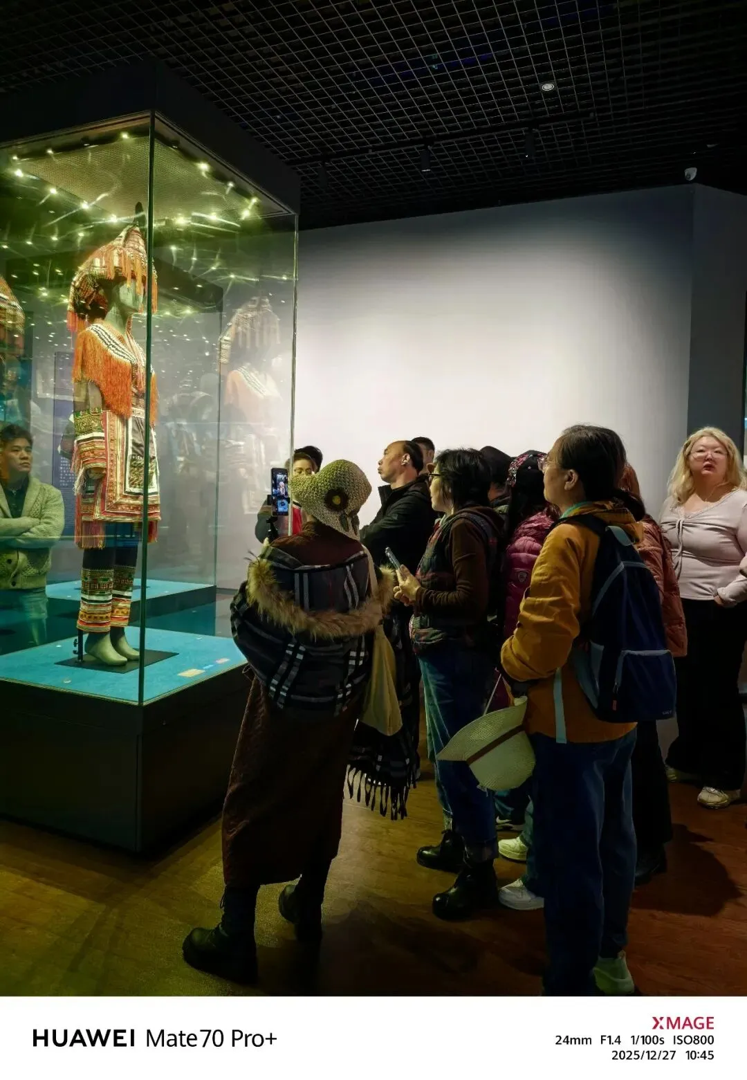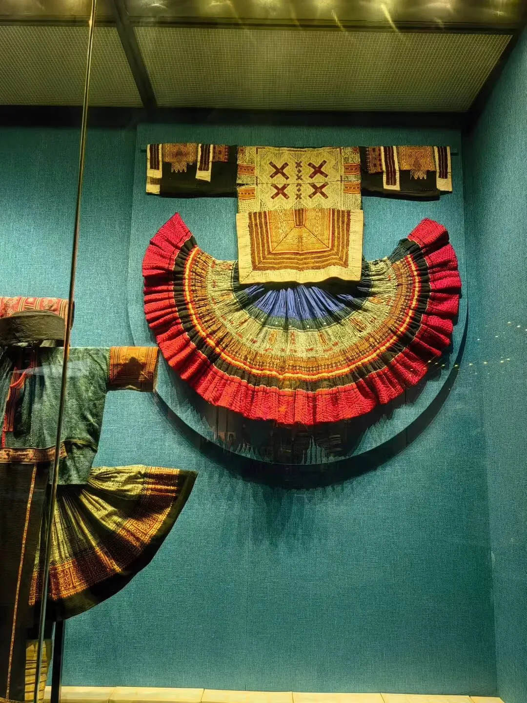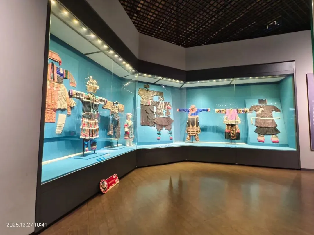 随后,我们跟随讲解员进了“霓裳羽衣”展厅。这里汇聚了壮族、瑶族等12个世居民族的传统生活、服饰、节庆和手工艺,织锦等特色文物。