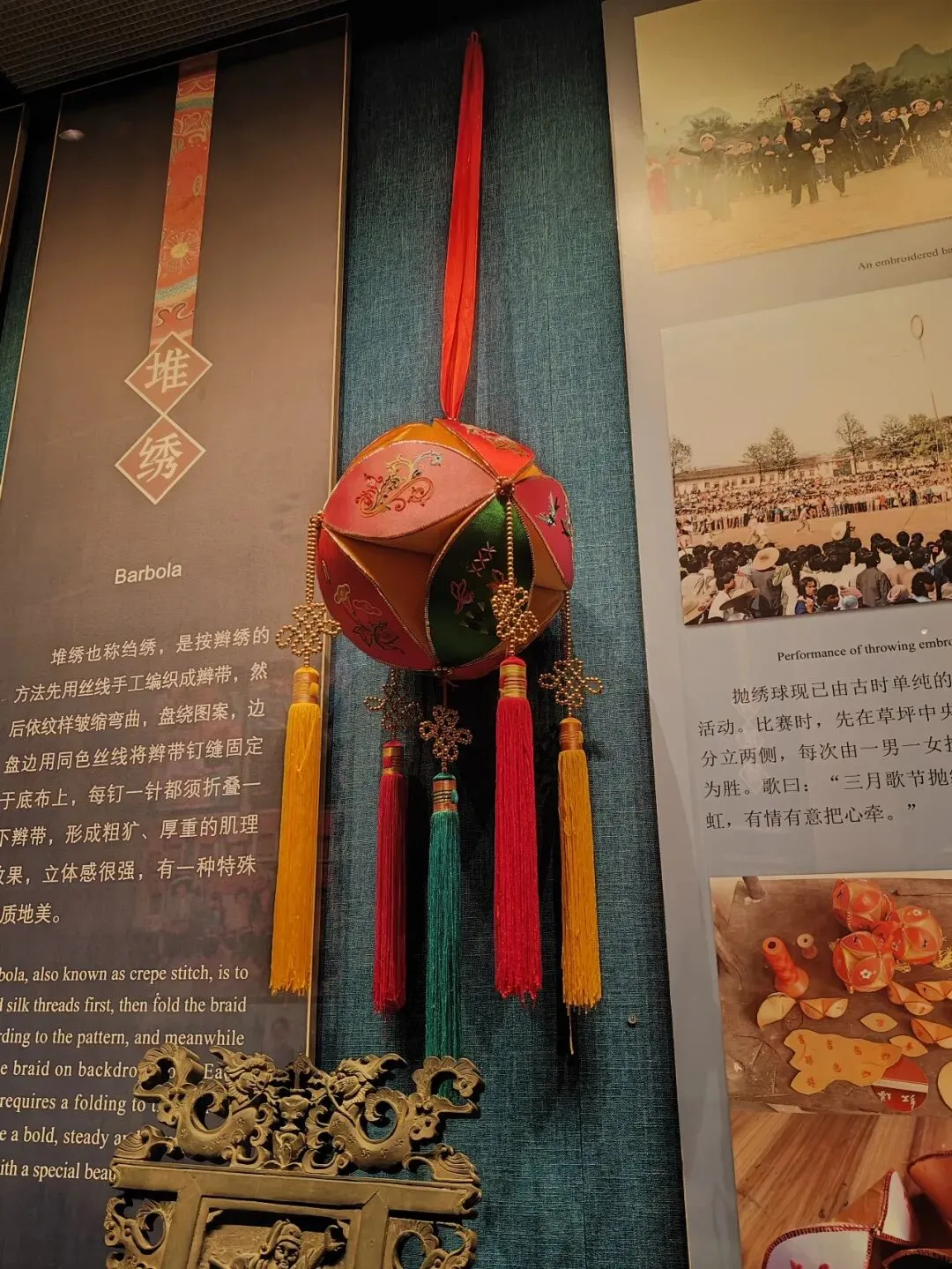 牌匾、坐具、绣床就不用说了,有一个木雕大祭台,简直是精美绝伦,上面的图案雕刻都极有讲究,就连两边的鱼都是包含寓意的,一边金鱼,一边鲢鱼,谐音寓意为“金玉满堂,连年有余”!