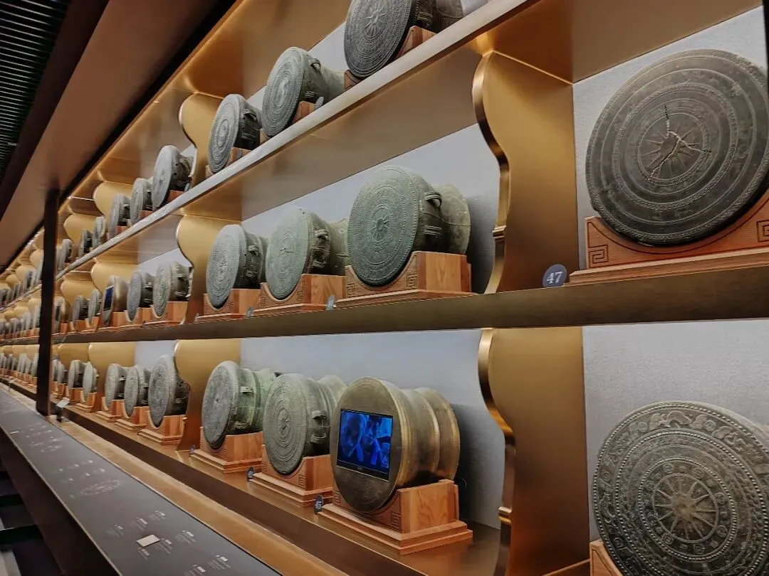 这里不仅有震撼的铜鼓墙、标志性铜鼓王(东汉云雷纹大铜鼓,面径165厘米,重299公斤,为世界最大古代铜鼓,也是镇馆之宝),还有完整呈现铜鼓从春秋到清末的发展脉络与骆越文化内涵(融合了稻作农业、青铜技艺、宗教信仰与民族艺术等多重元素),实在不简单。