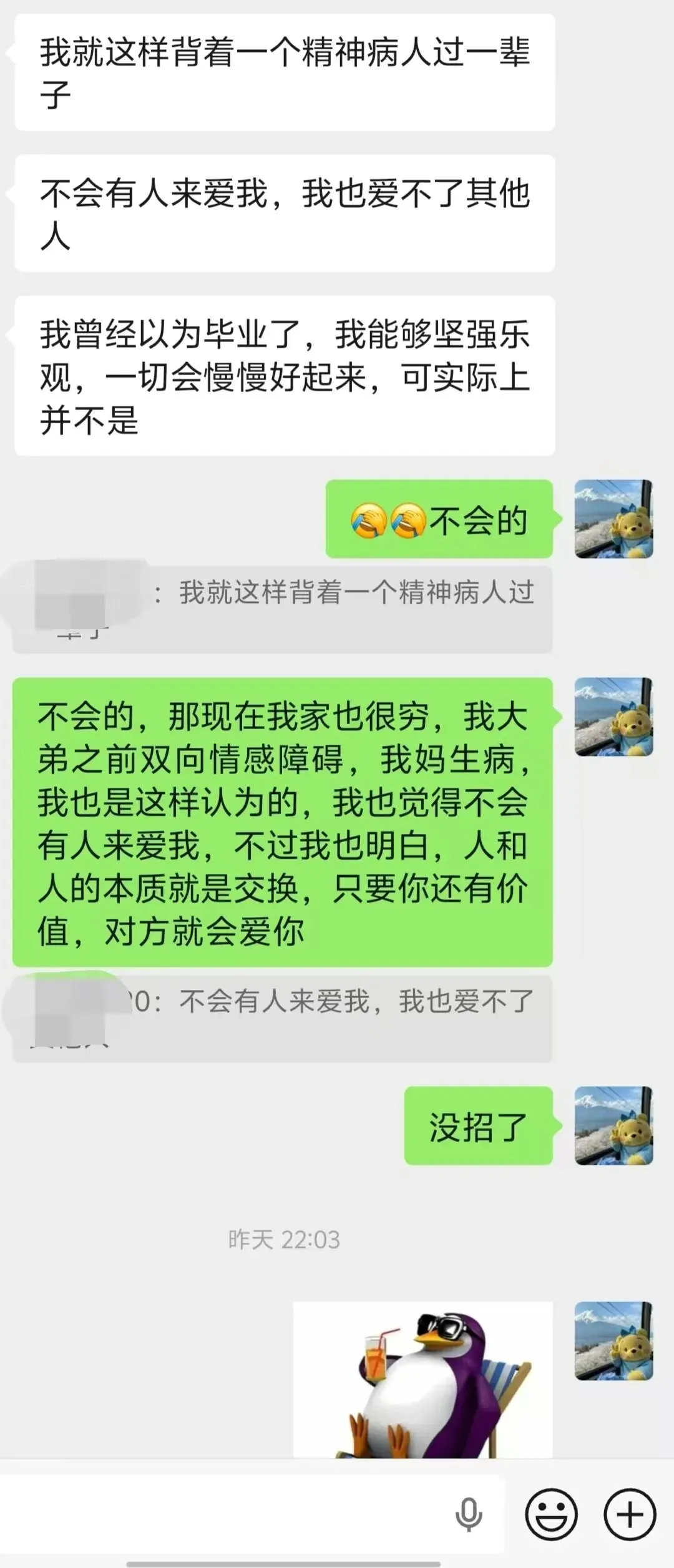 我也一直尽力安抚她的情绪。我觉得不是的。一个人会来爱你,不会因为你的家境贫寒,还是没钱,他都会爱你。而不爱你,哪怕你拥有这些条件和名、权、金钱,他爱的也只不过是你身上所拥有的东西,他爱的不是真实的你。那这样的人也是极少数的。毕竟现在的人都很现实。