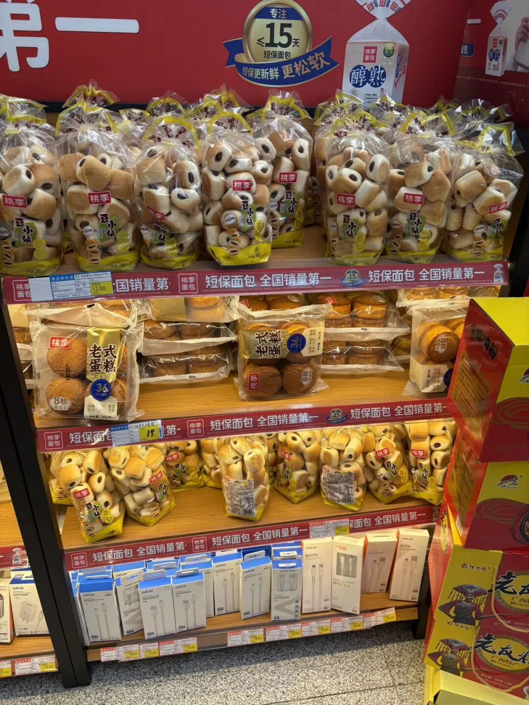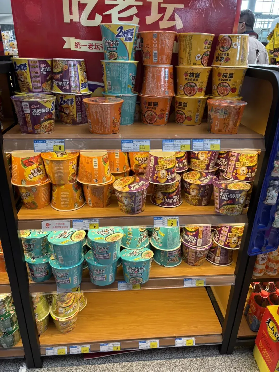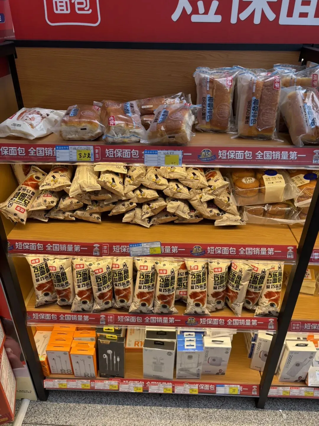 到了南宁东高铁站,最边上的两个候车点是我们这趟车的等候区,旁边就是小卖部。我进去逛了一下,发现面包和方便面种类都挺多,价格略微贵点跟北海银滩小卖部价格差不多。早知道就来这里买了,方便面和面包都挺占地方的,提了一路大箱小包还过安检挺麻烦。小卖部入口还有卖烤肠的,6元一根,胡椒味的。想到一天三顿都要在火车上解决,我也吃了一根补充点肉食,没什么味道感觉盐放少了。小卖部还卖很多广西特产,买的乘客还挺多。以前在武汉高铁站和北京西站小卖部没看到卖这么多种面包和方便面的,一般都是各种零食和饮料以及特产。