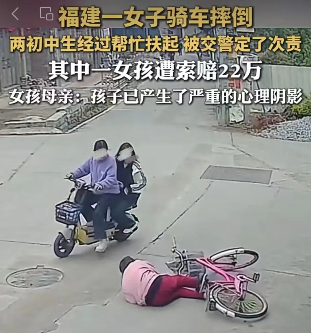 福建一老太太骑车摔倒,两初中生经过帮忙扶起,被交警定了次责,其中一女孩遭索赔22万。图源 大众日报视频号