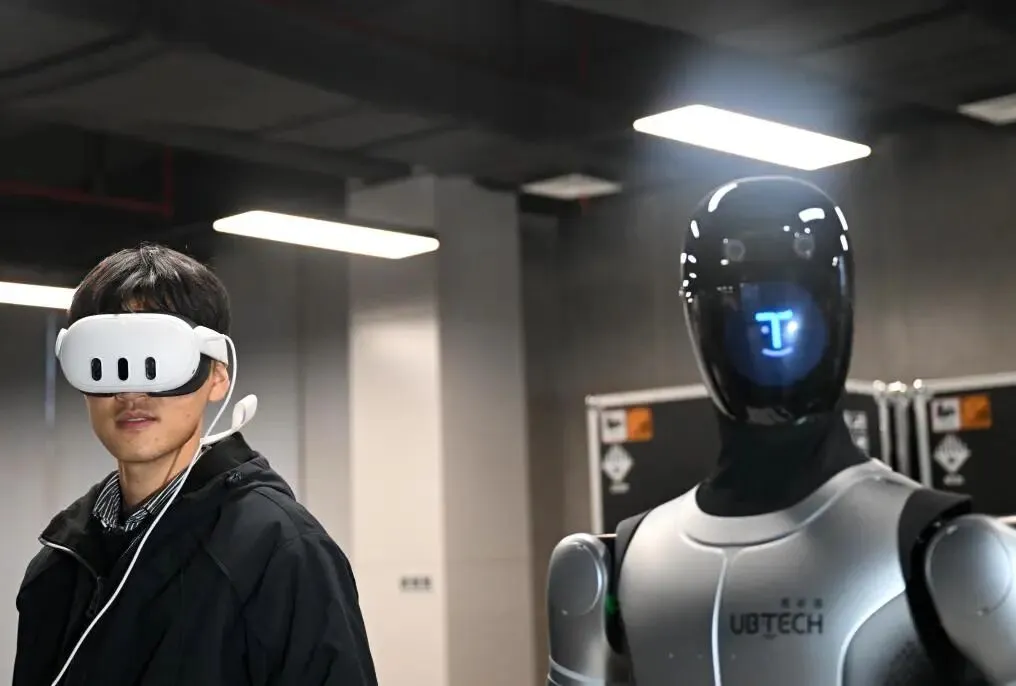 2026年1月30日,在广西柳州机器人产业园里,工作人员与工业人形机器人进行作业练习。黎寒池 摄