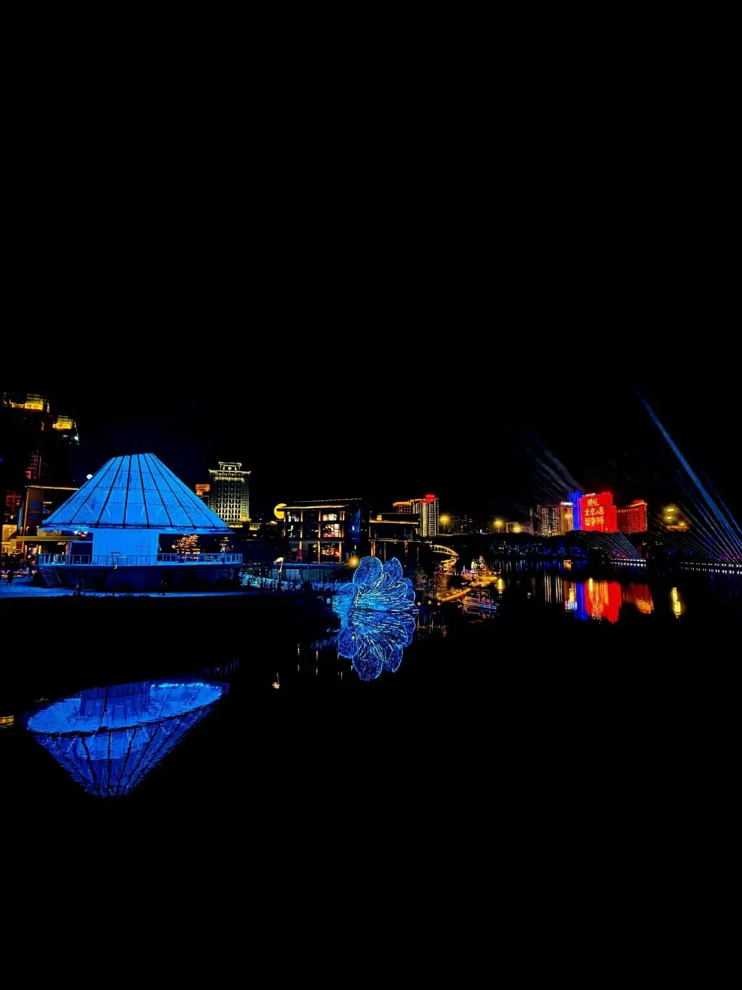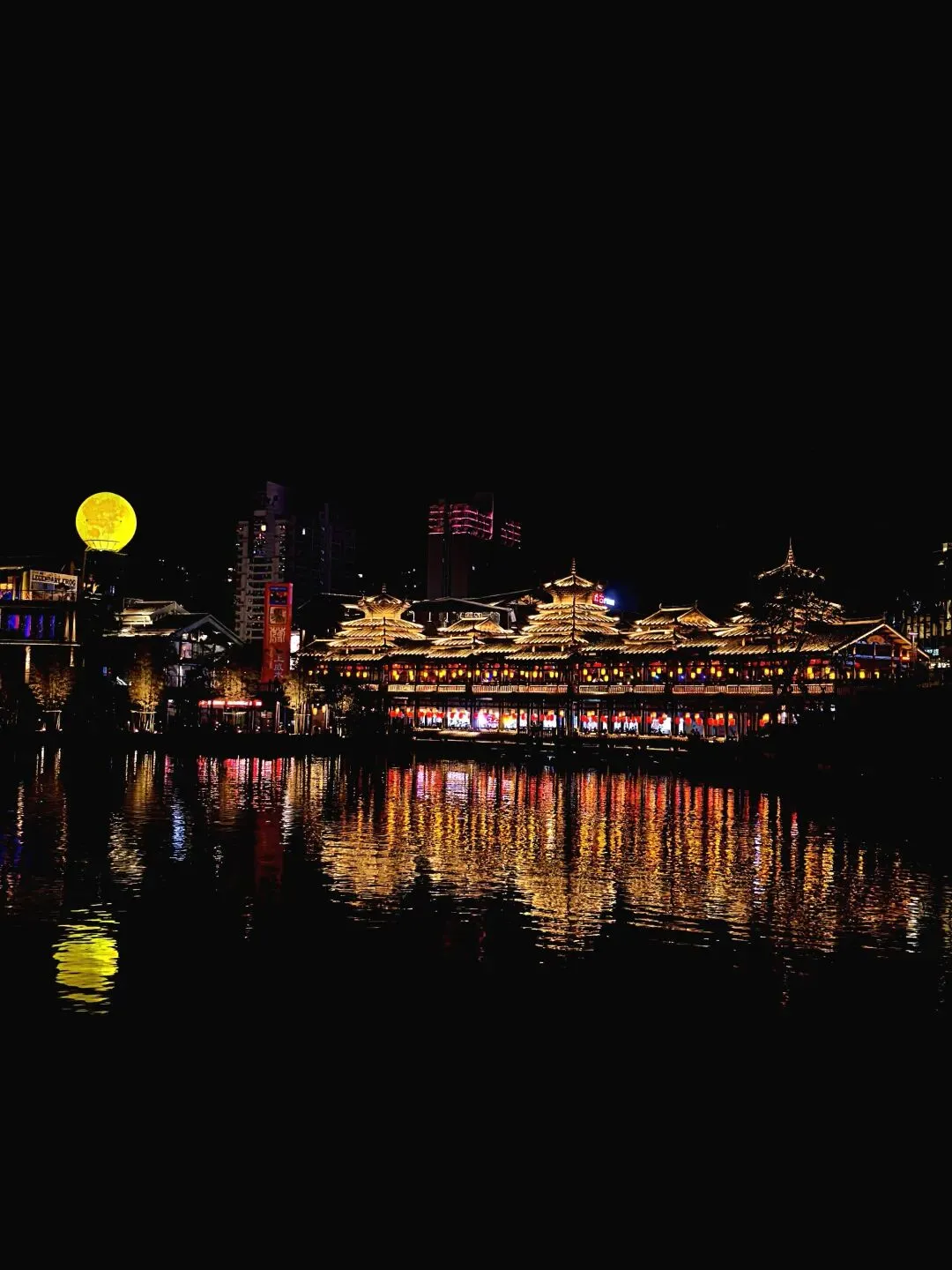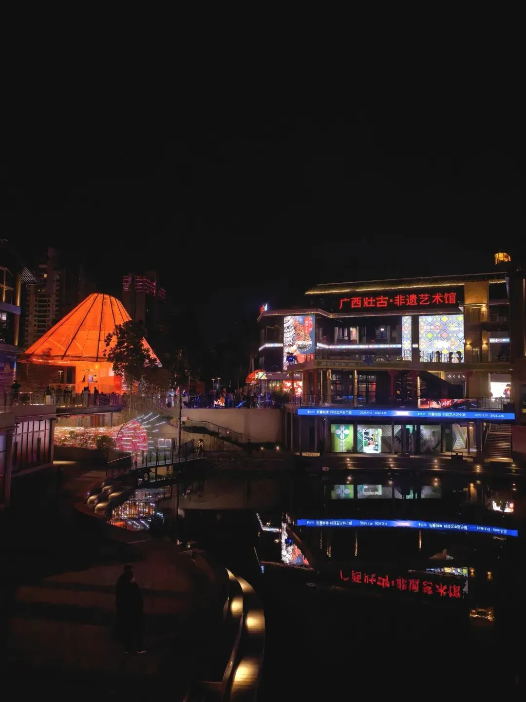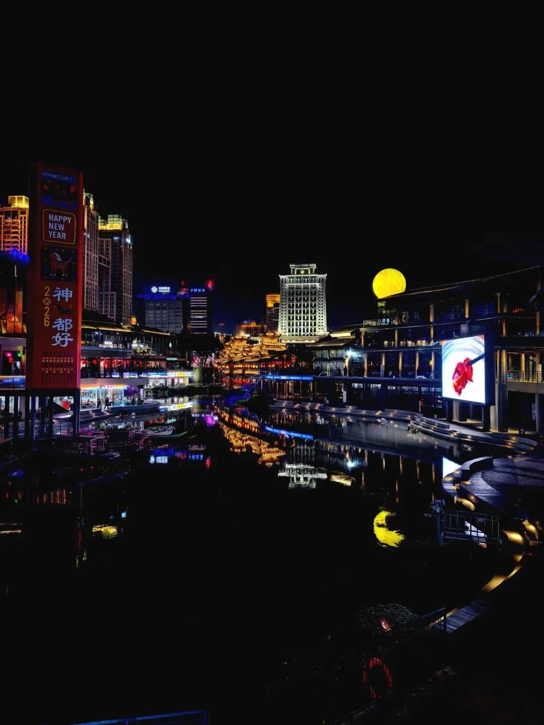 另一边是现代感十足的玻璃幕墙建筑,LED屏滚动着“2026神都好”的新年祝福,巨型月亮灯装置悬于湖心,如梦似幻。 更绝的是湖边的“莫离塔”光影艺术,暖光洒落水面,像给夜色支起一盏温柔台灯,20:00-22:00还有街头艺人即兴合唱,歌声混着湖风,氛围感直接拉满。