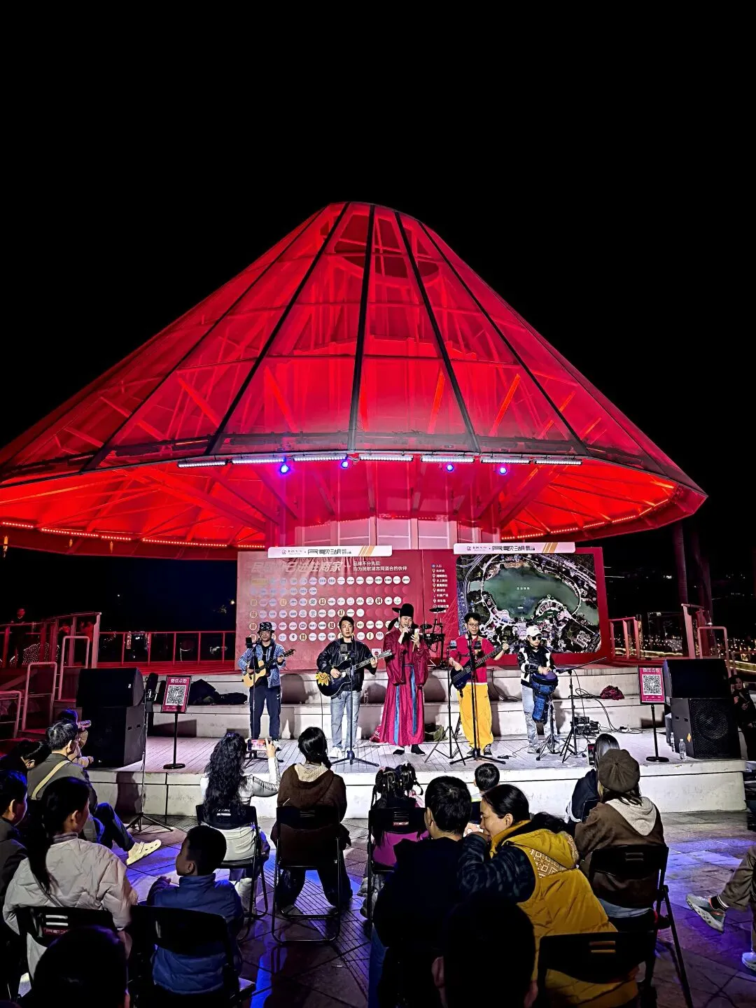 除了看景,这里还是“吃货天堂”:从螺蛳粉到老友粉,从酸嘢到烧烤,各色小吃摊烟火升腾;Livehouse里乐队热力开唱,年轻人围坐听歌,热闹非凡。
