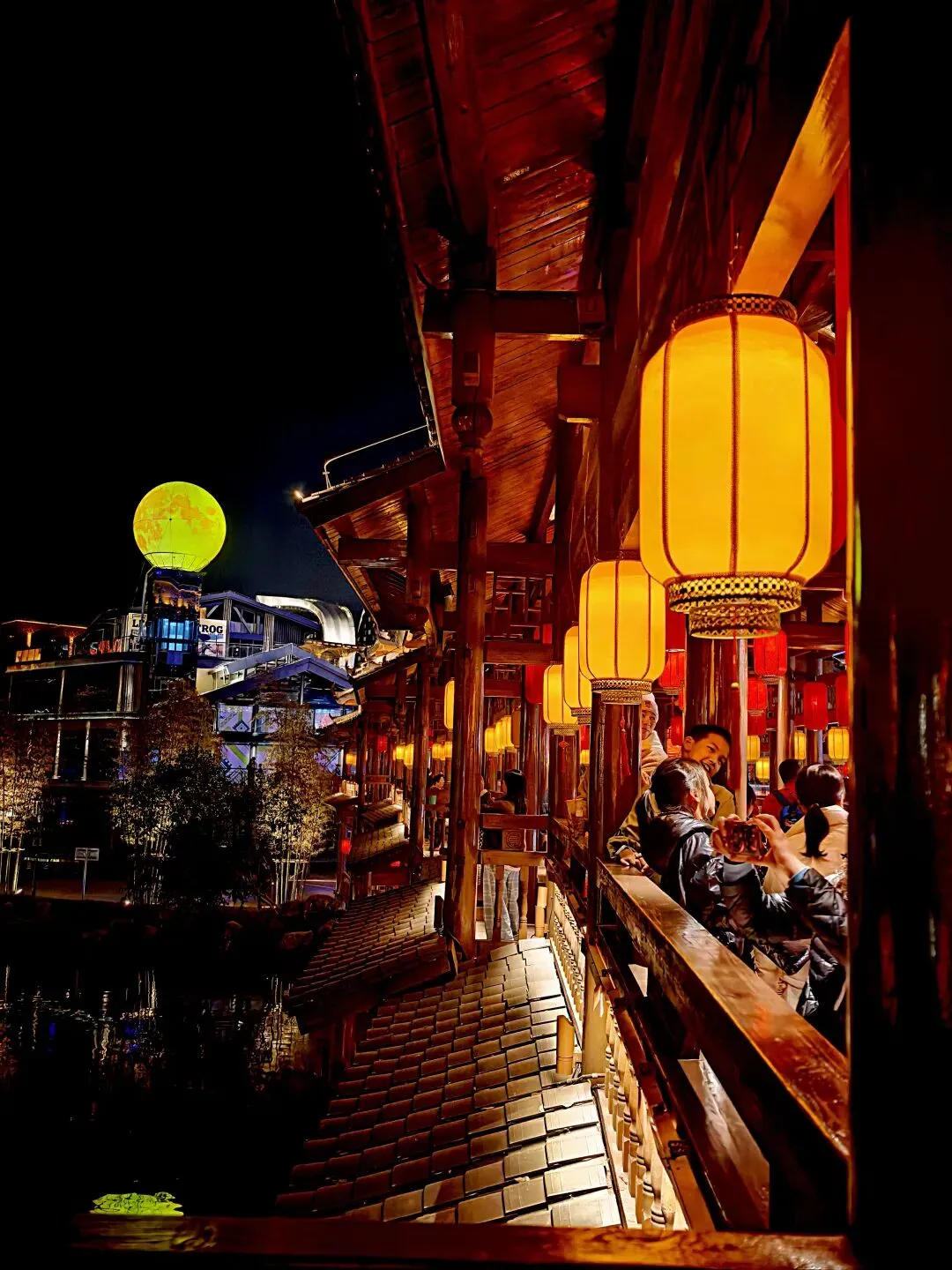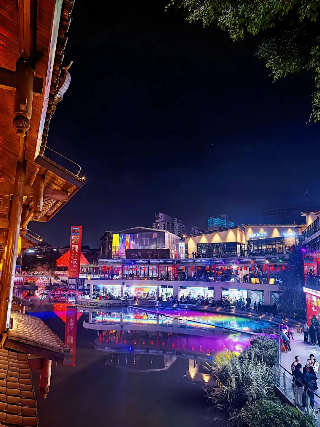 这里最迷人的,是古今交融的视觉张力:一边是仿侗族风雨桥的木质长廊,挂着暖黄灯笼,游人倚栏拍照,笑语盈盈;