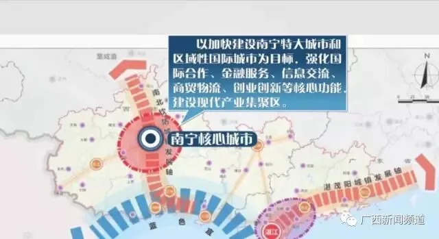 “一核”指的是南宁核心城市,以加快建设南宁特大城市和区域性国际城市为目标,强化国际合作、金融服务、信息交流、商贸物流、创业创新等核心功能,建设现代产业集聚区。