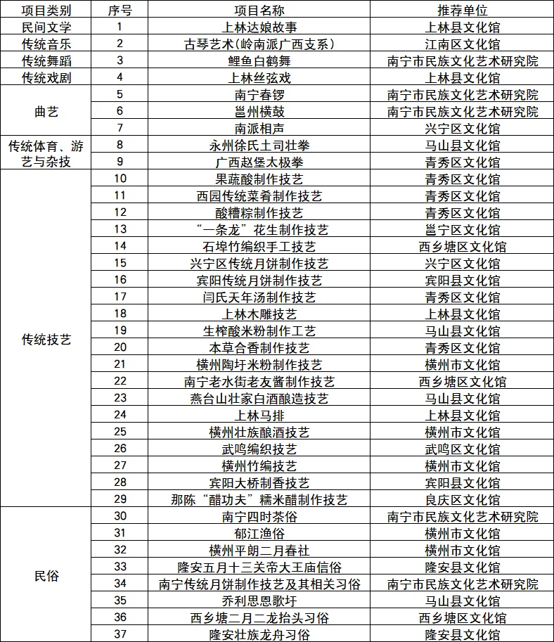 近日,南宁市正式公布第十一批市级非物质文化遗产代表性项目名录。此次入选的非遗项目共计37项,涵盖民间文学、传统音乐、传统舞蹈和传统戏剧各1项,曲艺3项,传统体育、游艺与杂技2项,传统技艺20项,民俗8项,充分展现了南宁非遗保护工作的丰硕成果与地方文化的蓬勃生机。